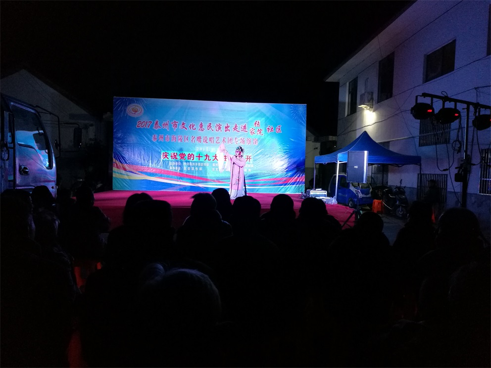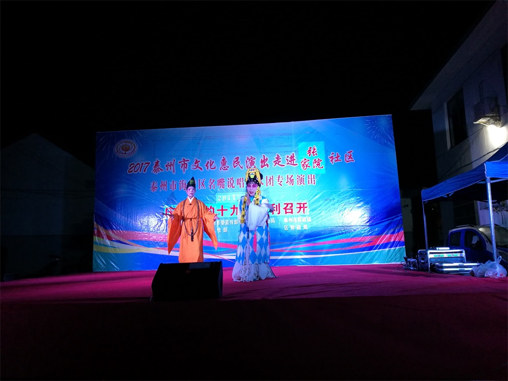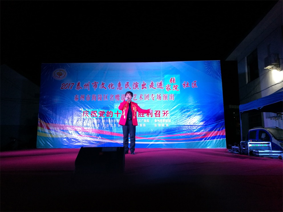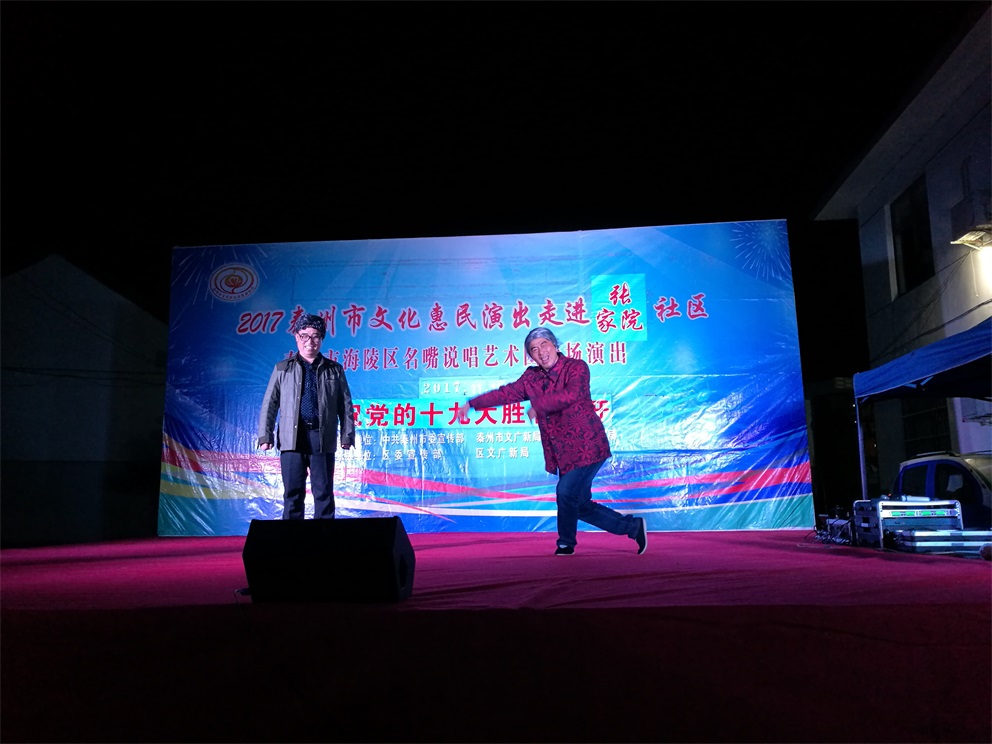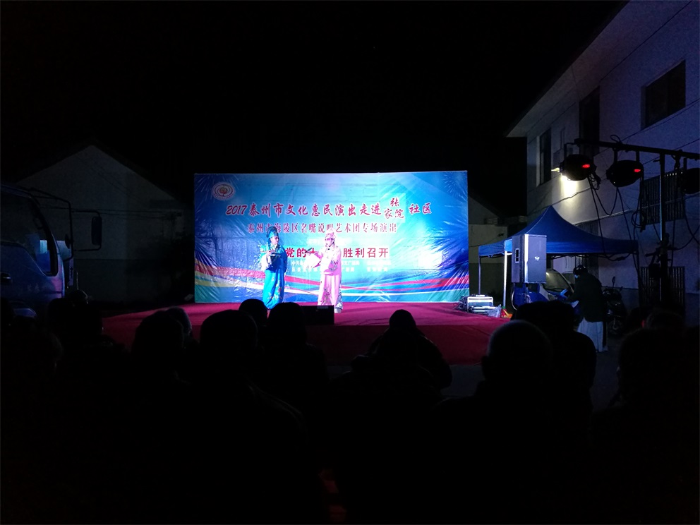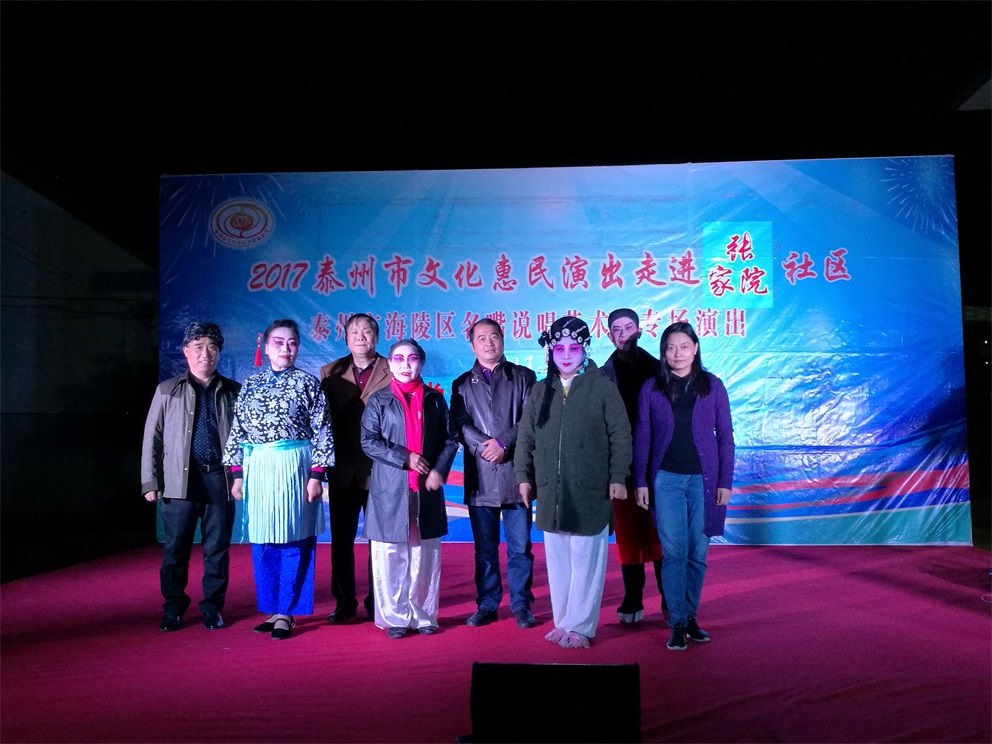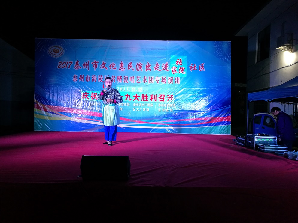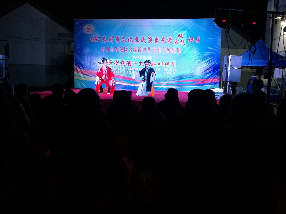 初冬的傍晚寒气逼人,名嘴艺术团来到了苏城镇张家院社区,由于中老年观众较多,应社区居民的要求,增加了部分戏曲节目,有扬剧,锡剧,淮剧等地方戏,百姓们在室外忘记了寒冷,现场热情高涨,演出时间到点了,还又增加,延长了节目。社区群众非常满意。