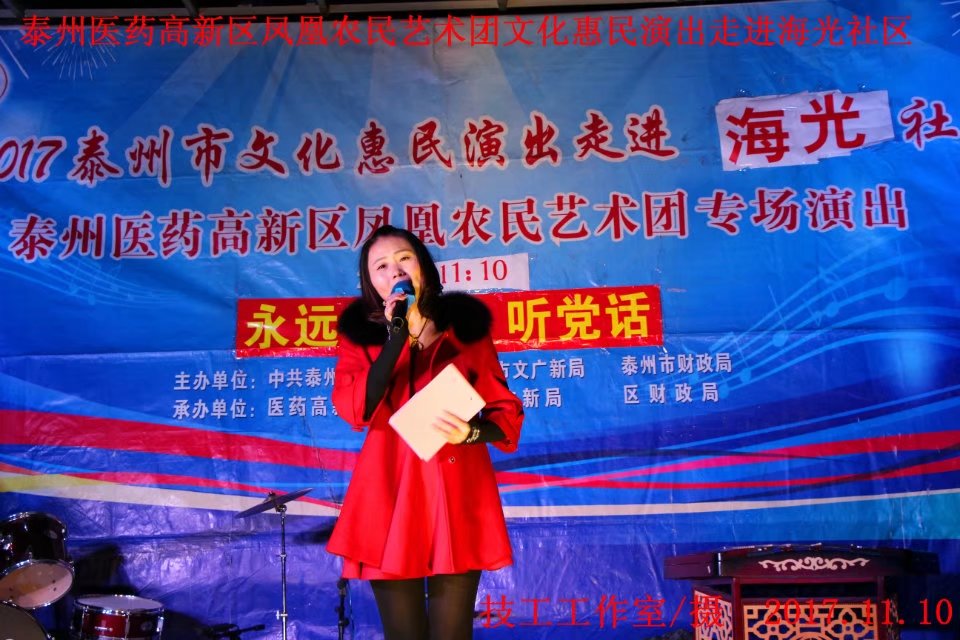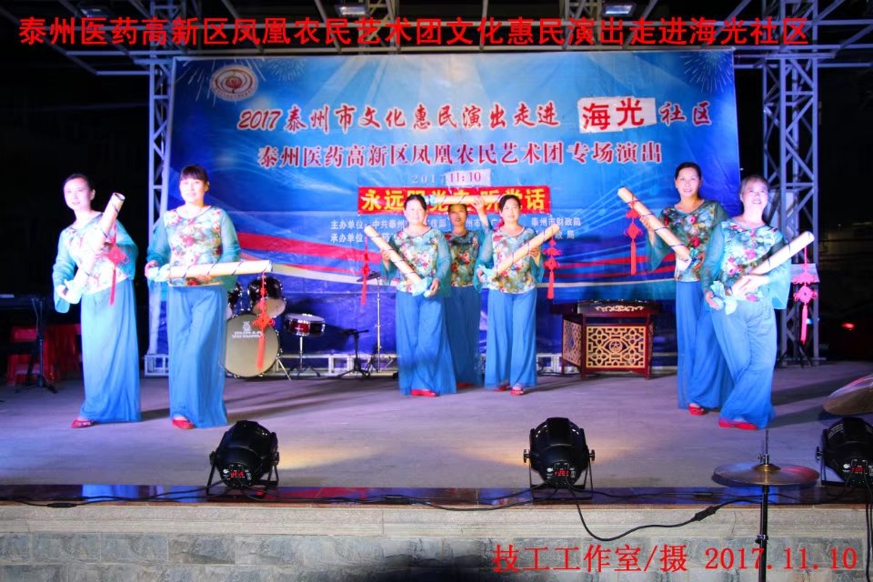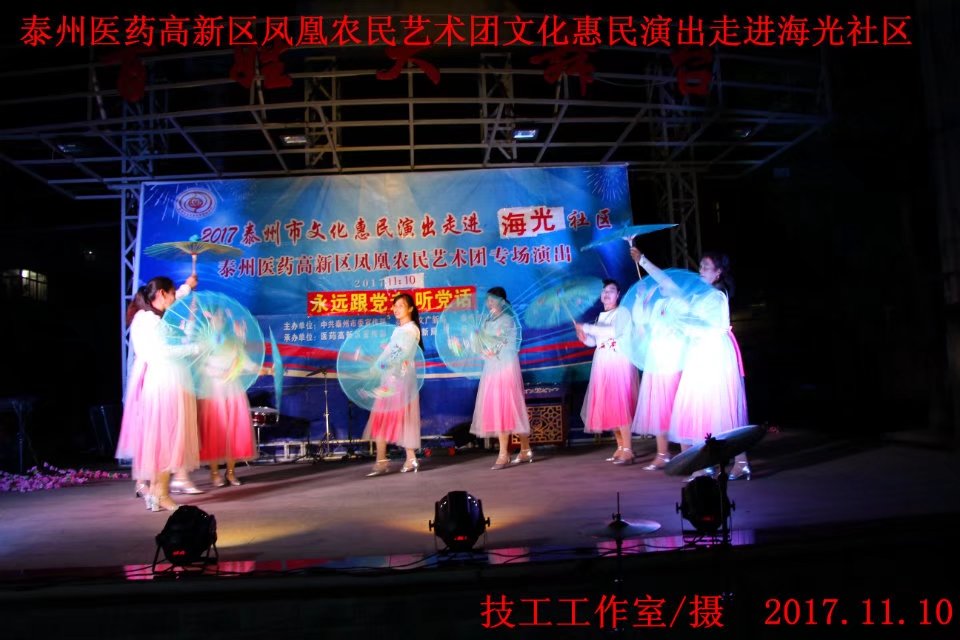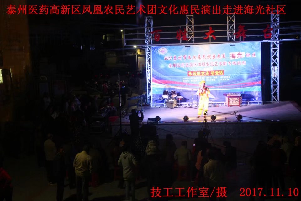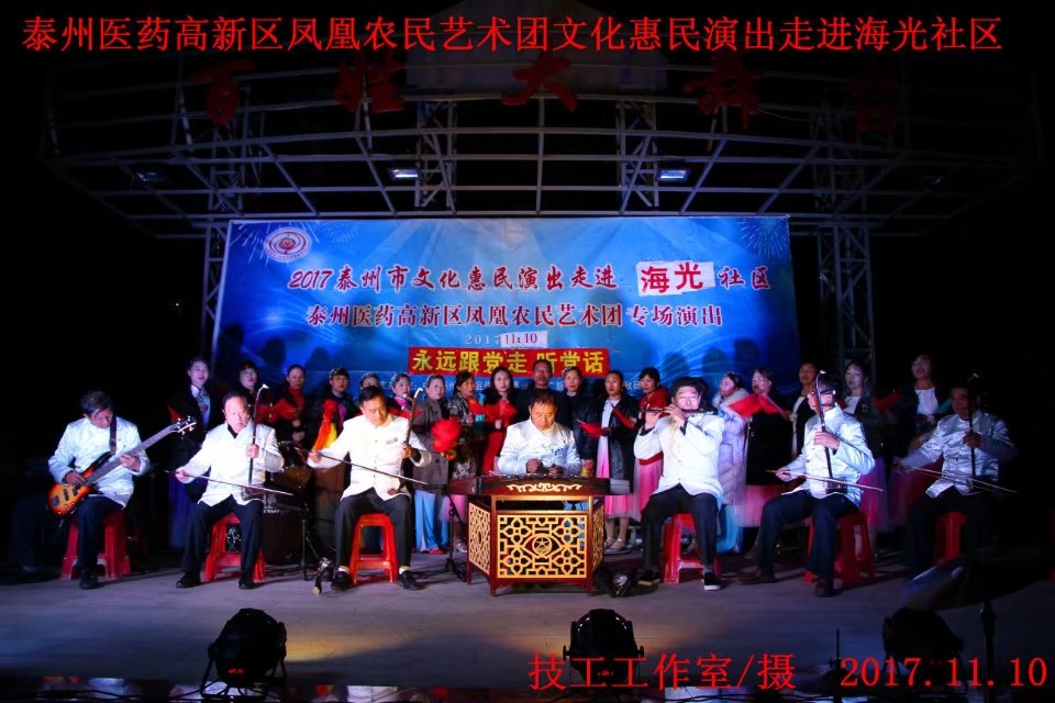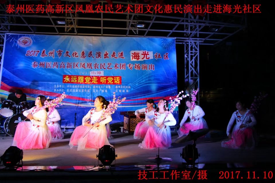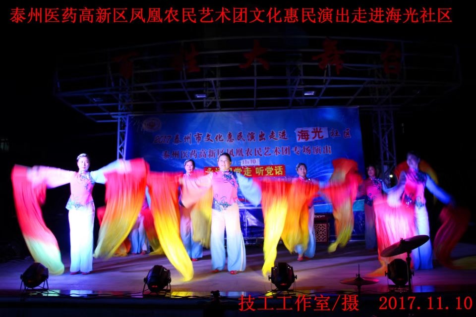 2017年11月10日,泰州医药高新区凤凰街道农民艺术团,应泰州海陵区城西街道海光社区的邀请,送来了一场文艺大餐。一个个精彩的演出呈现在居民面前。居民们看完宣传活动后,围坐在一起交流讨论,还有一位老人说:“作为一名85岁的老党员,看到这样的演出很高兴,一个个真情实意的表演,让我们切实感受到了党的关怀。”