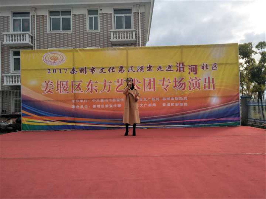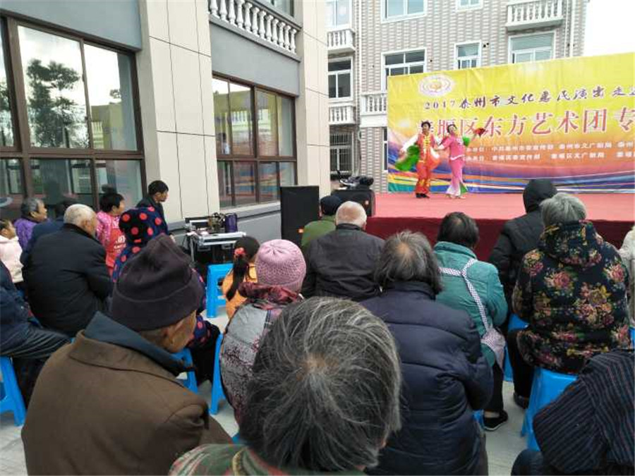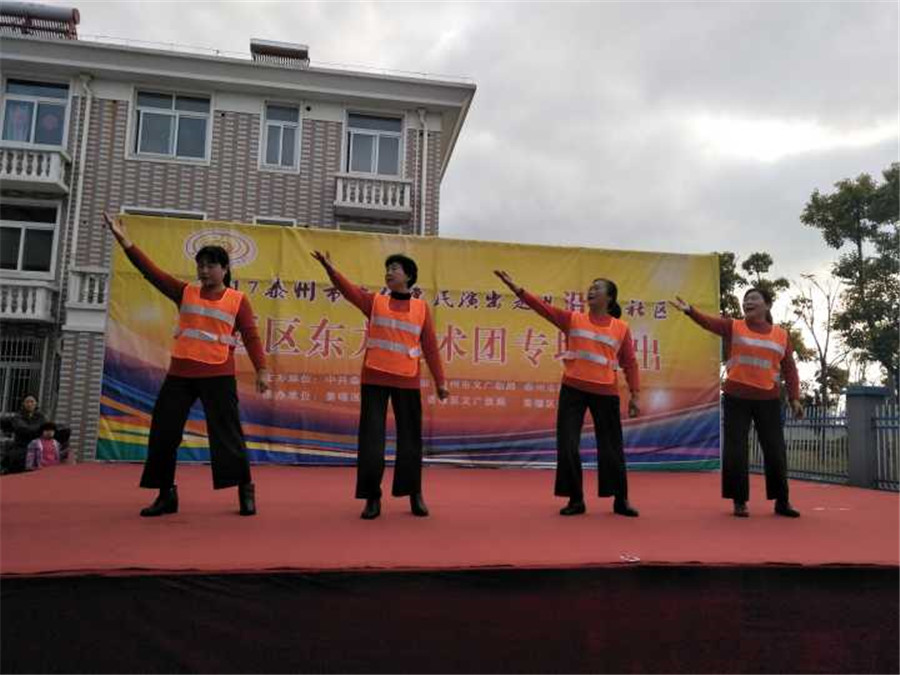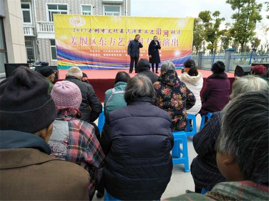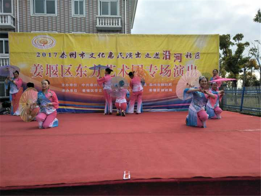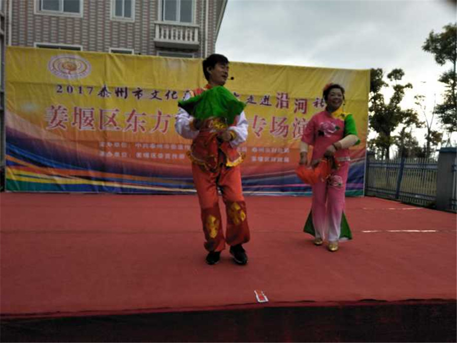 姜堰区东方艺术团应邀走进罗塘街道沿河村,为社区居民带去了舞蹈《江南梦》、《微笑》、歌曲《万水千山总是情》、二人转《小拜年串烧》、小品《良心发现》等精彩节目。