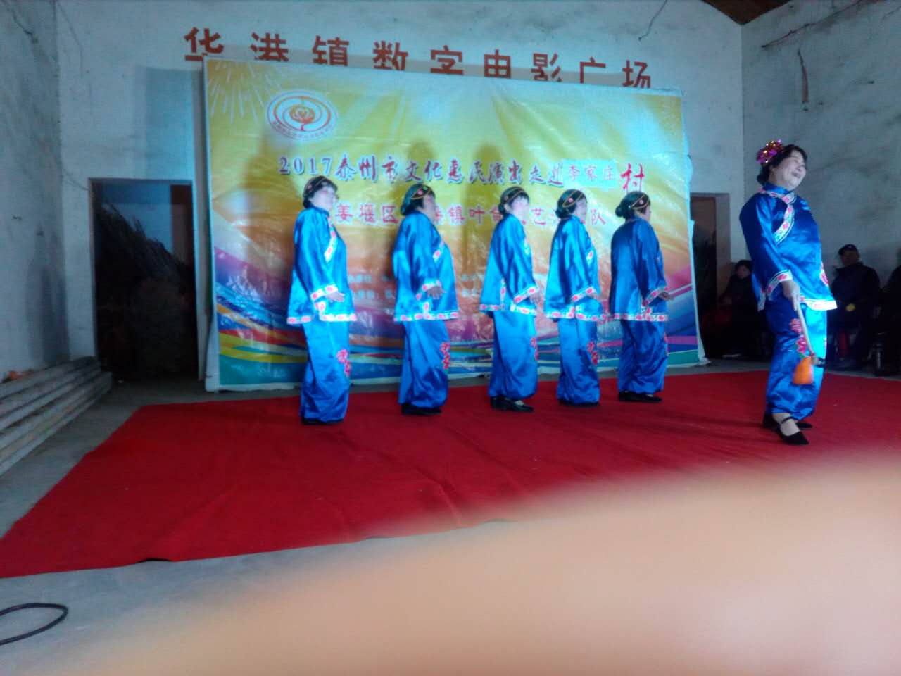 20I7年11月20日下午2点钟,姜堰区俞垛镇叶甸文艺演出队在姜堰区华港镇野马村惠民演出,共演13个节目,有舞蹈,独唱,小戏剧,时间120分钟,观看人数200多人,群众非常满意。