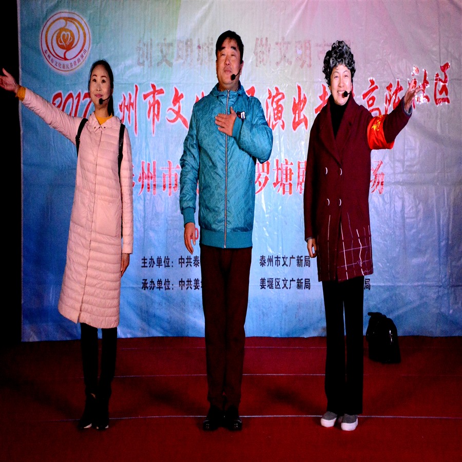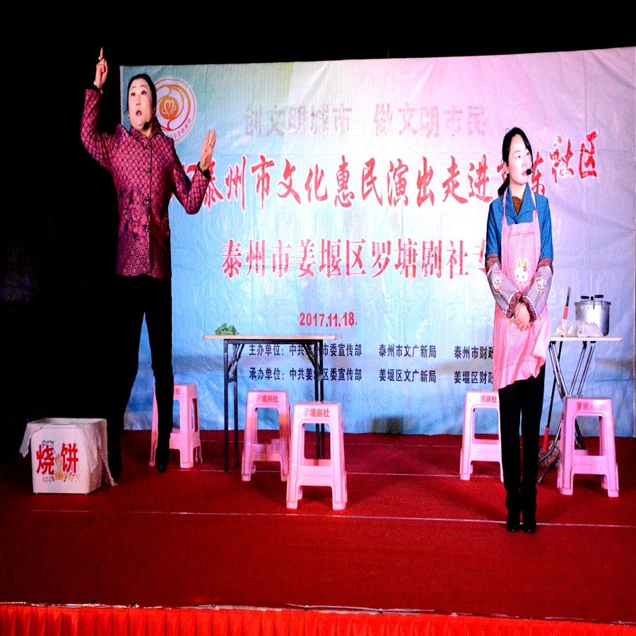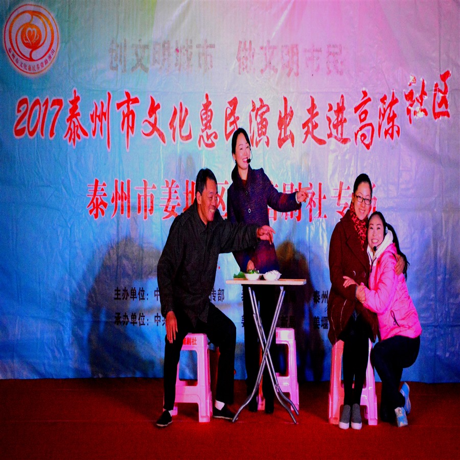 11月18日,姜堰区罗塘剧社应罗塘街道高陈社区邀请,2017年泰州市文化惠民专场演出于当晚7点在东大街凤凰广场上演。为适应观众不同层次的文化欣赏需求,姜堰区罗塘剧社精心策划了13个丰富多彩的文艺节目,随着欢快喜庆的音乐响起,舞蹈《张灯结彩》拉开了演出序幕,当天演出不仅有激情奔放的民歌与民舞,而且有耳熟能详的戏曲与小品,压台小品《父还子债》,该小品是根据笫五届感动泰州·美德善行十大人物,姜堰区张甸镇农民李开诚为死去的儿子偿还欠债的真实故事创作而编导,剧情生动感人,演员入情入戏,情节催人泪下,整台演出效果,弘扬社会正气,倡导诚实守信,气氛热烈,掌声不断,赢得了广大观众的一致好评。当天晚上演出时长100分钟,观众达到200多人,优美而精彩的表演,给高陈社区广大市民送去一份丰盛的文化大餐。