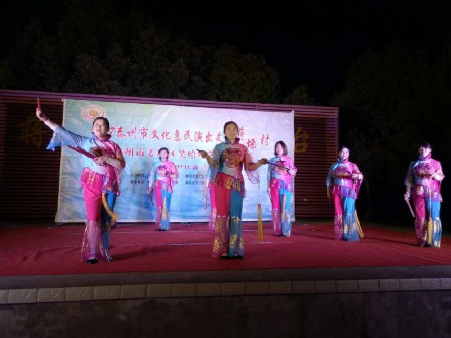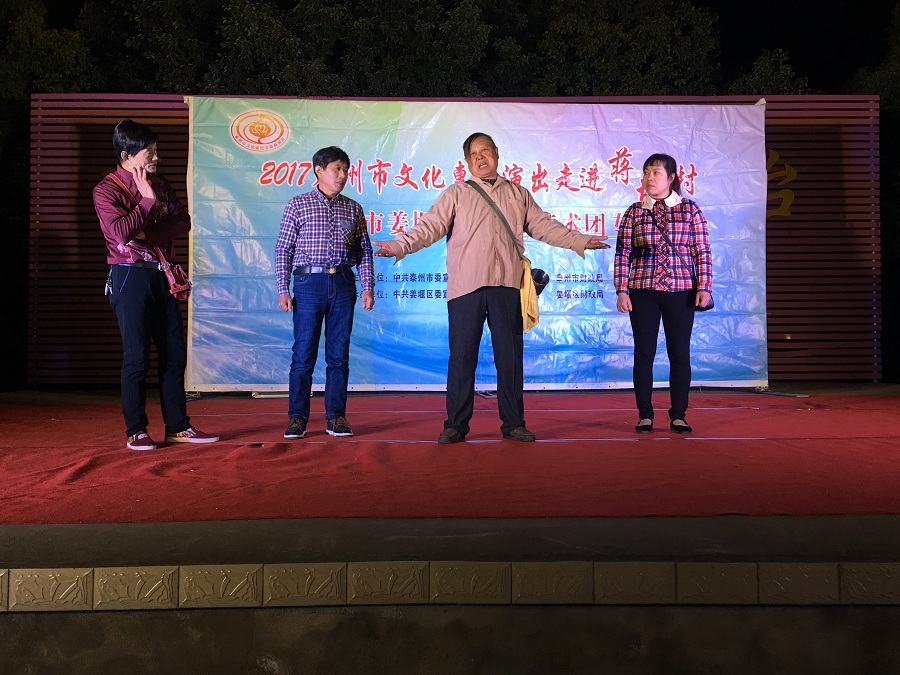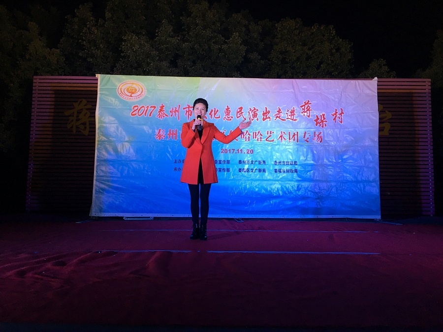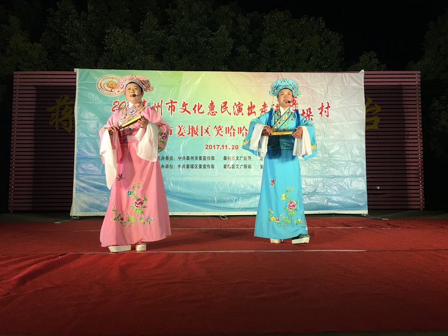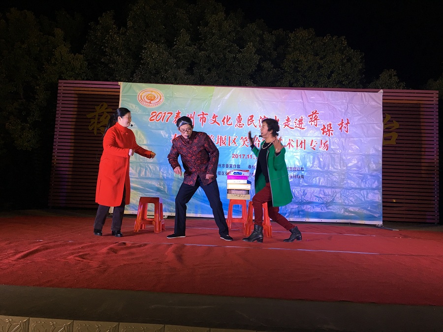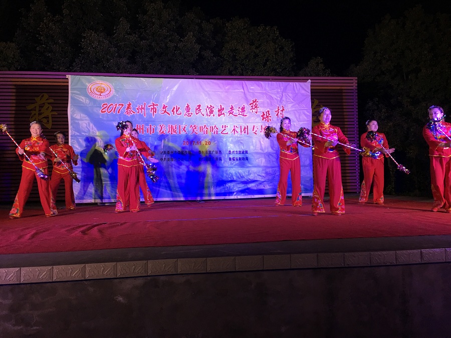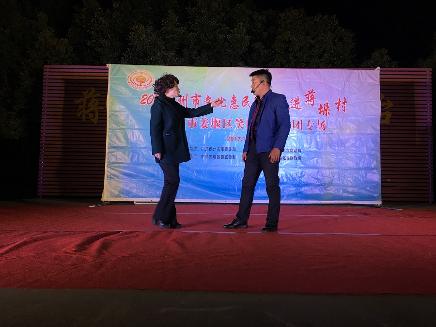 11月20日,姜堰区笑哈哈艺术团文化惠民专场演出走进蒋垛村。晚上7点演出在蒋垛村大舞台准时开始,现场表演的节目有舞蹈《红红火火大中华》、莲花落说唱《文化惠民笑哈哈》、小品《两个媳妇争婆婆》方言韵白《路在脚下》萨克斯演奏《北国之春》、方言韵白《拐过弯来是幸福》、天津快板《有话好好说》、相声《趣说泰州话》、表演唱《财政惠民乐农家》、以及独唱等11种形式、12个节目。整台演出时长115分钟,观众约400人左右。节目形式多样、内容丰富,尤其相声、快板、喜剧小品、方言韵白等语言类特色节目赢得了观众的阵阵笑声和掌声,受到村干部、群众的一致好评。