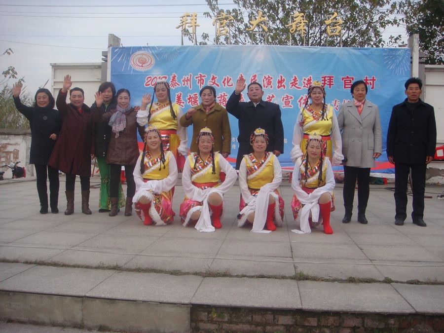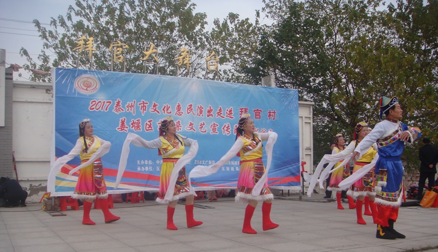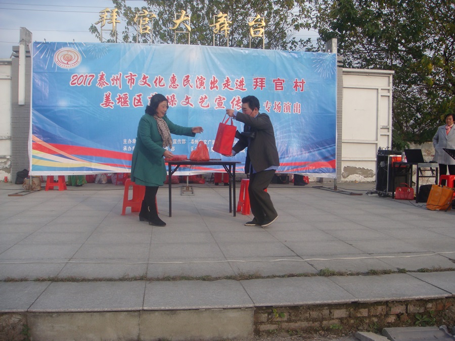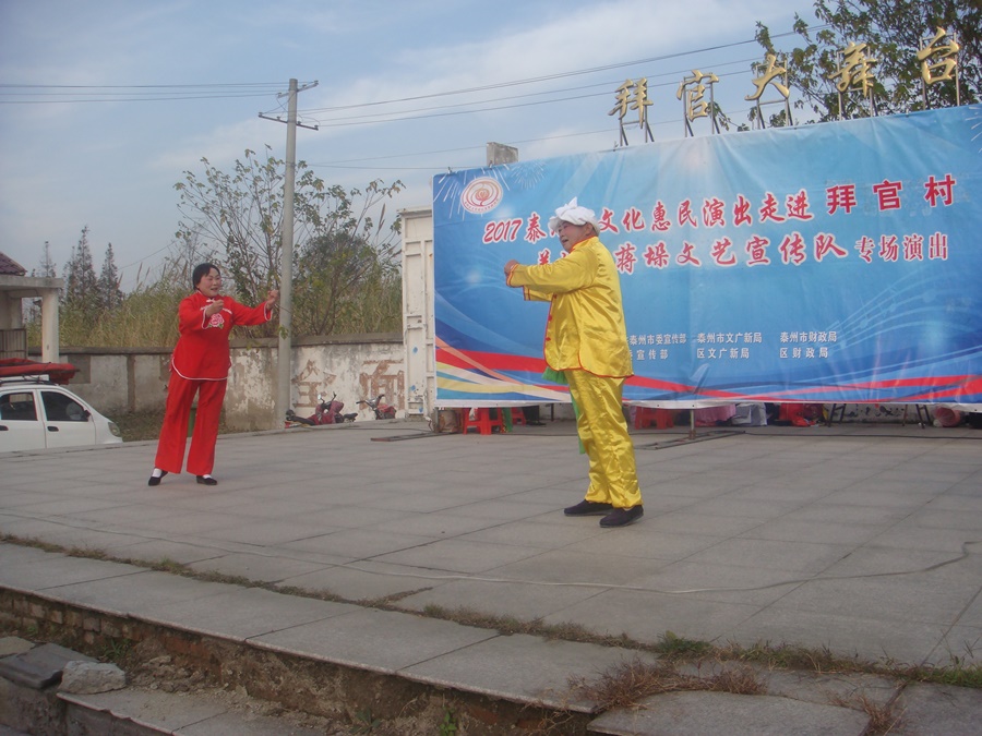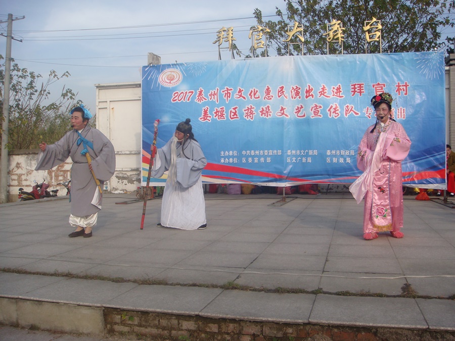 2017年11月24日姜堰区蒋垛文艺宣传队走进白米镇拜官村,受到干群热情接待,下午2点半为拜官村村民惠民演出一台文艺节目,节目形式多样,有戏剧、舞蹈、独唱、表演唱、小品等,演出时长近100分钟,100多观众笑声不断。