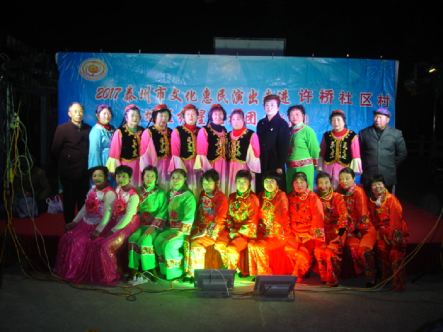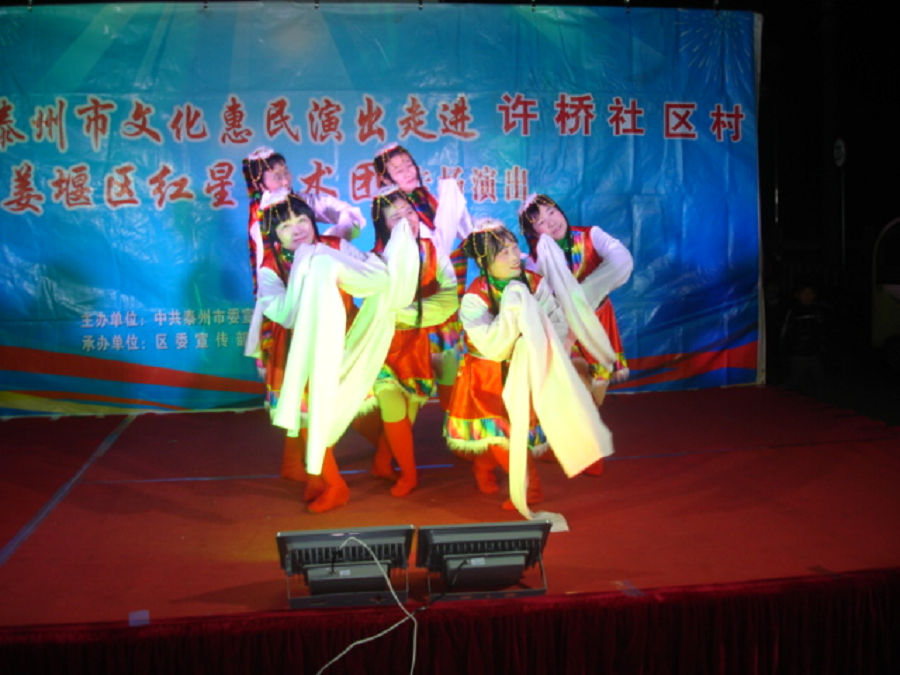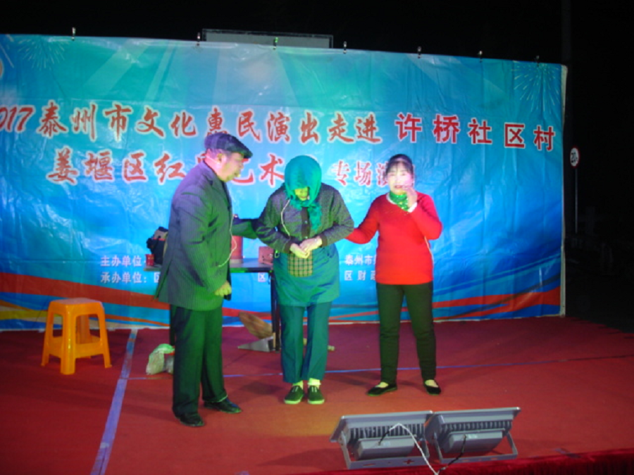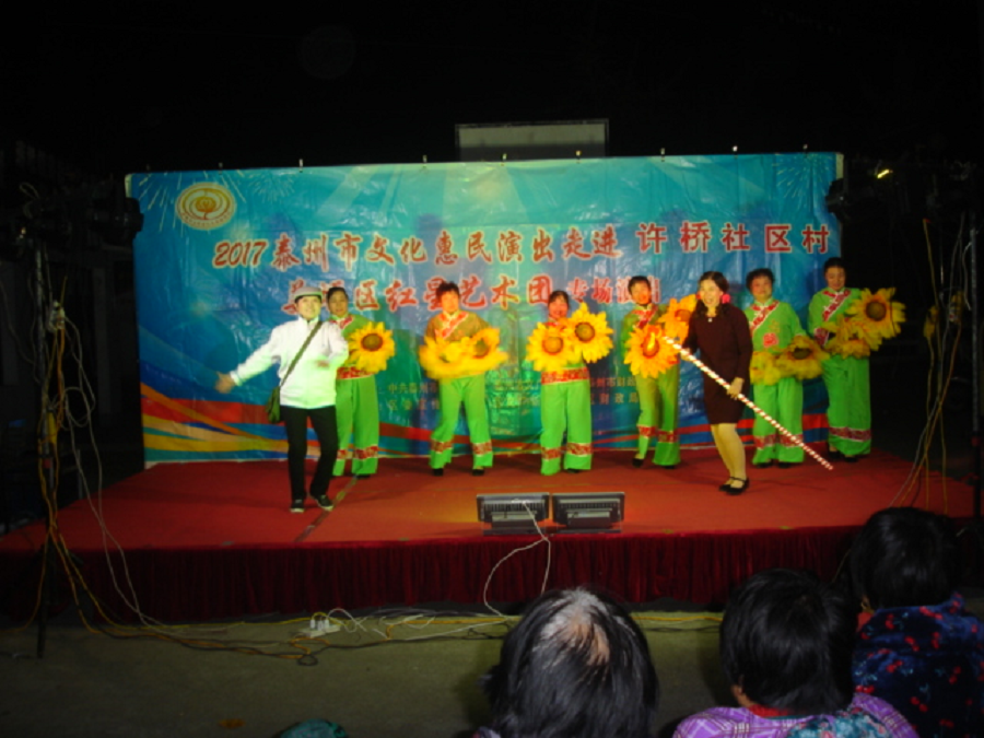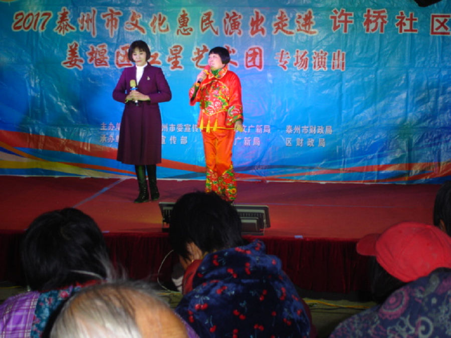 姜堰红星艺术团应许桥村的邀请,为广大居民带来一场精彩的表演。观众们热情欢迎红星艺术团的到来。演员们在欢乐音乐声中跳起了优美的舞蹈,广场上挤满了观众,演员们的演出受到一致好评,纷纷表示希望剧团再来社区演出!