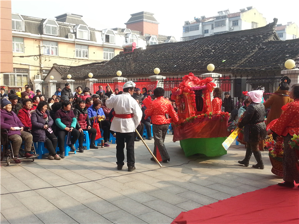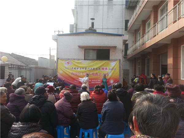 3月2日下午,泰州市惠民文化演出走进海陵区城中街道税务社区,海陵区大篷车戏曲艺术团专场表演在社区五一路卫生服务中心广场开展。《划船荡桨逛泰州》的演员们撑着小船,挑着花篮,在社区后街背巷逛了一圈,并唱出泰州这些年来的变化,群众纷纷走出家门观看;女生小合唱《同心共筑中国梦》,唱出了普通老百姓心中的中国梦;淮剧《白蛇传》(游湖选段),扬剧《王樵楼磨豆腐》唱的惟妙惟肖,引人入胜,居民津津乐道。