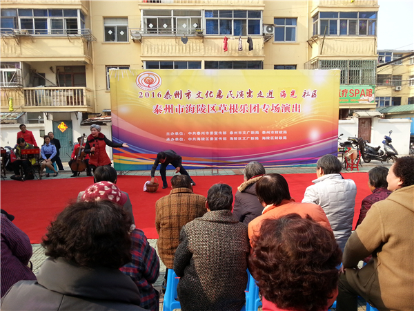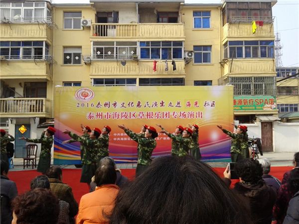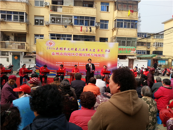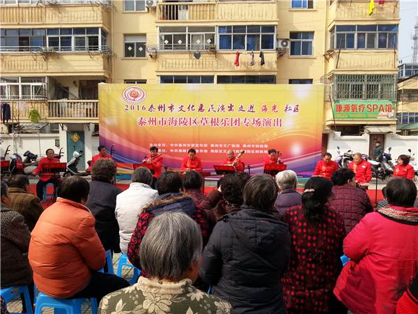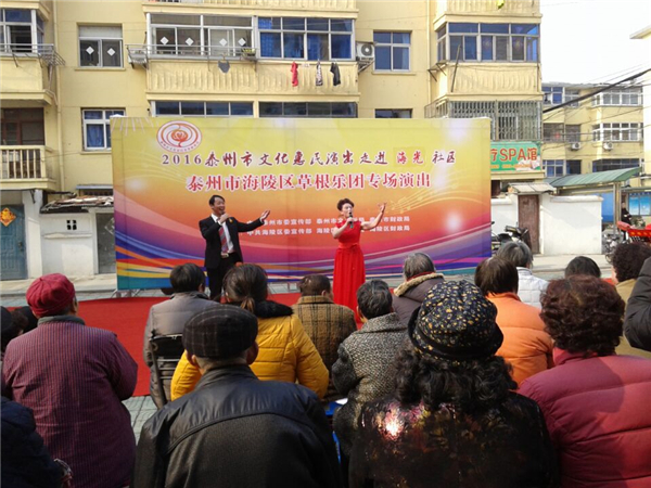 为迎接三八妇女节,3月3日下午,由中共泰州市委宣传部、泰州文广新局、泰州市财政局主办,中共海陵区委宣传部、海陵区文广新局、海陵区财政局承办,2016年泰州市文化惠民草根乐团专场演出首次走进海光社区,给社区居民带来一场文化盛宴。