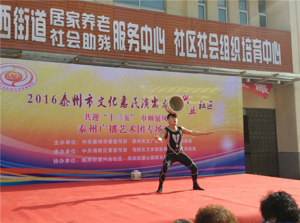 下午两点半,在兴业小区紫竹苑文化广场,泰州广播艺术团的演员们拿出自己的看家本领,歌舞《桃花扇》、相声《大双簧》、杂技《顶缸》等,一个个精心准备的节目轮番上演,吸引了不少社区居民前来观看,其中就不乏咱们广播艺术团的忠实粉丝。“今天电台到我们兴业社区来表演了许多节目,有美猴王,还遇到了颖玉和司健,我是他们的铁杆粉丝,电台组织的这个艺术团特别的有趣,带给我们居民更多的快乐”,在活动现场,热心观众俞苏悟不停地拿起手机记录下精彩的一幕。