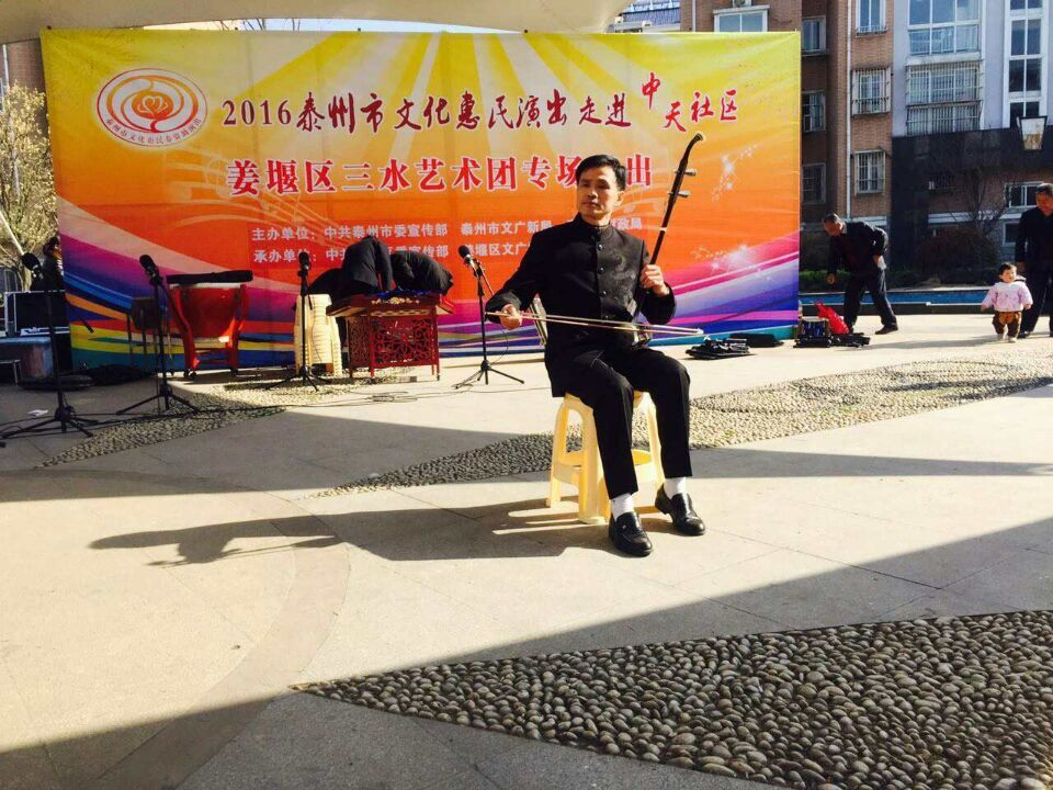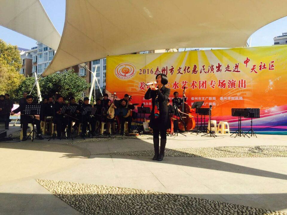 昨天下午,姜堰区三水艺术团文化惠民演出走进中天社区。为那里的百姓送去了一台精彩的文艺节目。温暖的阳光下,白色的风帆阳蓬内,早早围满了等候观看的百姓。本场演出的节目中,除了有深受观众喜爱的民乐合奏,二胡、琵琶、竹笛独奏等充分展示我团民乐演奏超强实力的节目外,还顺应观众要求,新增了黄梅戏和越剧经典唱段。《牛郎织女》,《到底人间欢乐多》,《金玉良缘》这些耳熟能详的唱段让观众产生了共鸣,很多人都情不自禁的跟着哼唱,陶醉其中。并且意犹未尽,掌声不断。为了不负众望,演唱者又加唱了一段黄梅戏‘’谁料皇榜中状元‘’,形成了很好的亲民互动效果。《新式气功大舞》、《太极功夫扇》也是我团新增加的节目,静中有动,展示中华养身健体功夫,贴近百姓生活。整场节目编排给观众耳目一新的视听享受,受到了现场观众的热烈追捧和赞誉。
