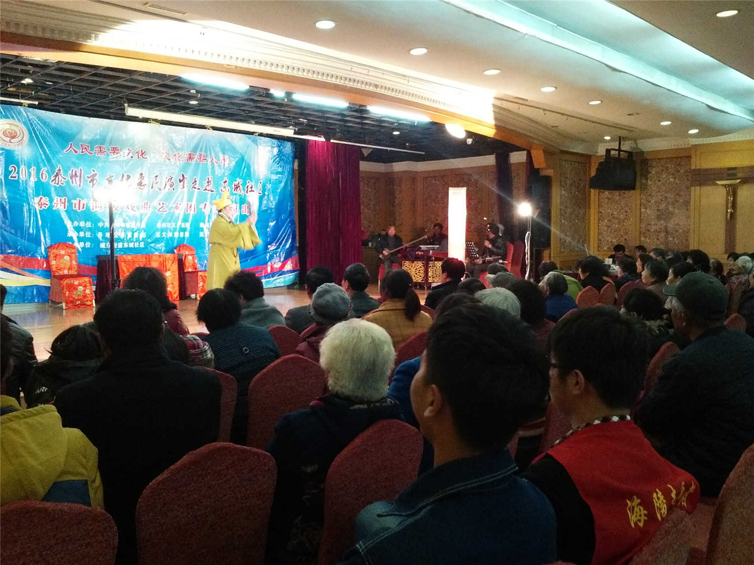 3月29日下午,东城社区在原野大酒店三楼,邀请海陵区戏曲艺术团给东城社区居民奉献了一场精彩扬剧《挑女婿》,扬剧《小尼姑下山》及淮剧传统戏精彩片断。外面春寒料峭,原野大酒店里面掌声雷动,其乐融融。