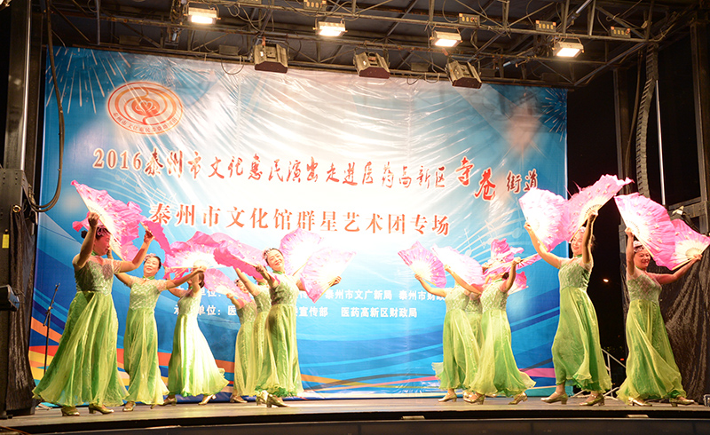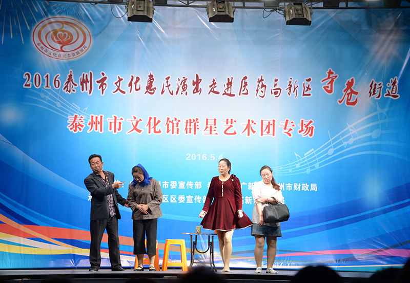 原来是泰州市文化馆群星艺术团将一场文化大宴送到这儿,当地的居民把演出舞台车围了个水泄不通。演出的节目多种多样,有舞蹈《春风里阳光下》、二胡齐奏《光明行》、鼓韵说唱《牢记十要十不要》、小组唱《印象泰州》、小品《相亲相爱一家人》等节目,现场的气氛十分热烈,DCP电声乐队更是在观众的掌声和喝彩中连续演唱了四首歌曲。