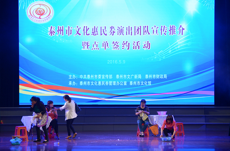 5月9日下午,泰州市文化惠民券创新应用及示范演出团队宣传推介暨点单签约活动在市文化馆圆满举办。来自江苏省演艺集团的专业院团与泰州市级文艺团队、专业剧团等纷纷亮出看家本领,在市文化馆民众剧场给观众带来了一场精彩的演出,器乐合奏、戏曲、歌舞、木偶戏、杂技、小品等节目,形式多种多样,近三个小时的演出让观众目不暇接。