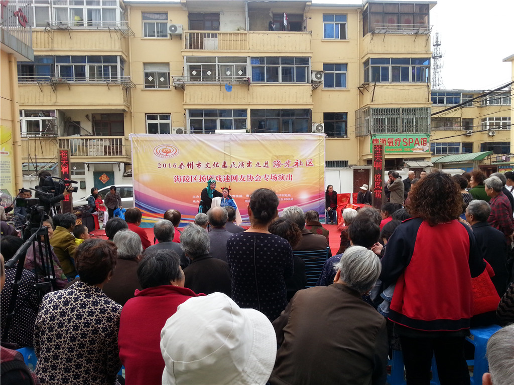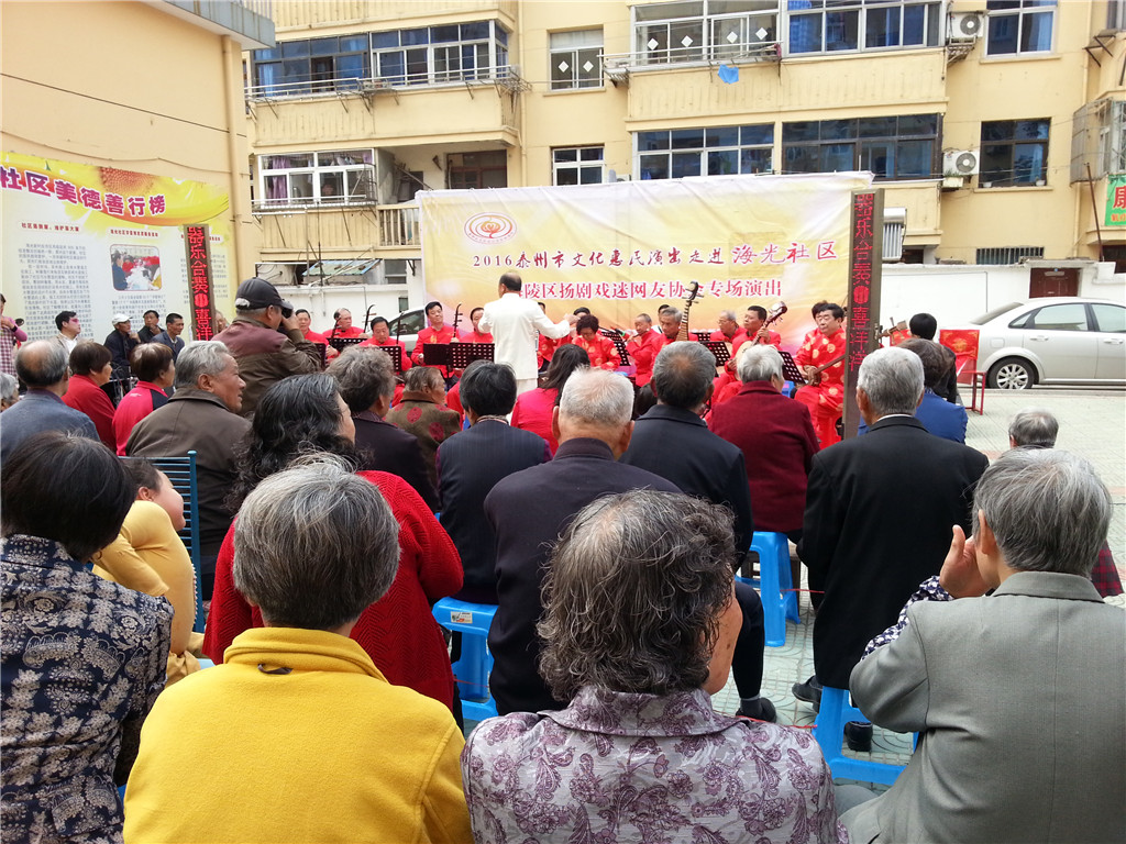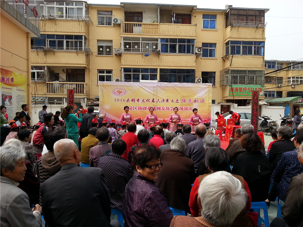 2016年5月7日下午,扬剧戏迷网友协会走进海光社区,为广大的居民朋友们带来了精彩的扬剧表演。扬剧《看灯、挑女婿》、《向朝阳》、《安寿宝卖身》、《梁祝》等经典选段让社区群众不禁拍手称好。同时此次演出正值母亲节前夕,社区的儿童们也为所有的母亲献舞《嘚啵嘚啵嘚》、《鱼儿》,社区的志愿者们说唱表演《四奶奶齐夸居家养老好》、器乐《喜洋洋》等形式多样、内容丰富的节目吸引了广大的居民群众前来观看。演出在观众们热烈的掌声中画上了圆满的句号。大家都表示看的意犹未尽,期待下一次更精彩的表演并希望这样的文化惠民演出能经常深入到基层来,丰富老百姓的业余文化生活。