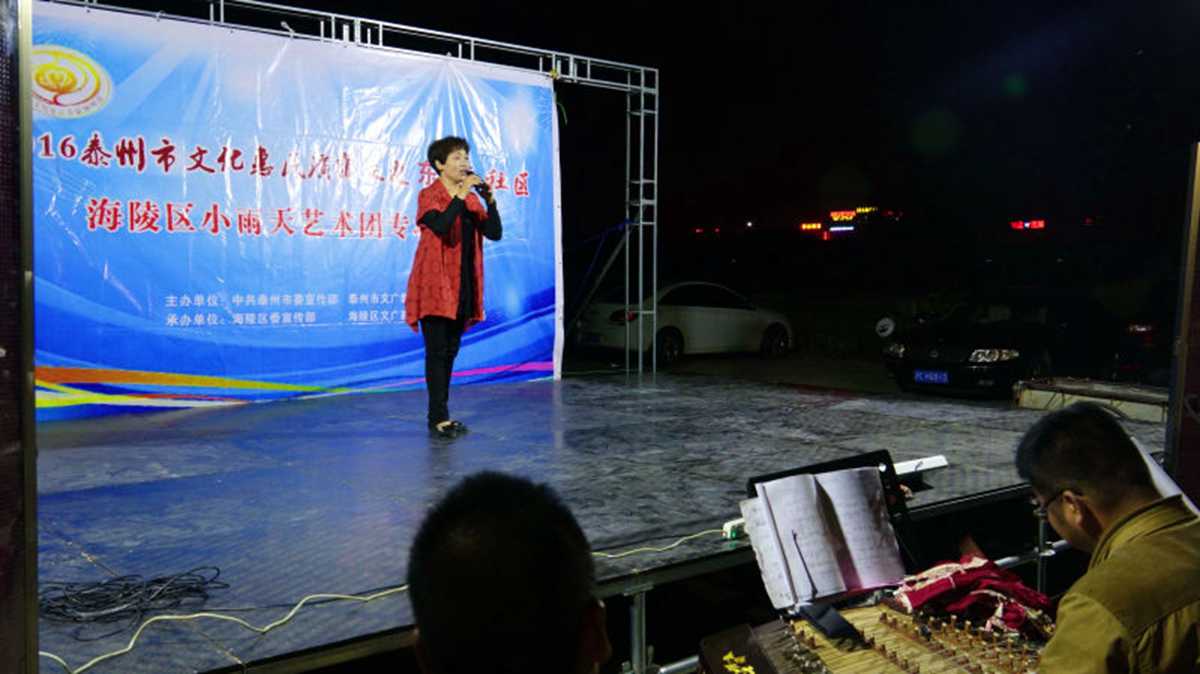 小雨天艺术团为了给村民一个完美的演出,下午三点就开始搭台工作了。钢架结构的舞台配备有台词显示屏,二胡、古筝各种乐器一应俱全,演出还没开始停车场上就站满了看戏的群众。《双下山》、《梳妆台》并清唱了几段戏曲,将群众的热情推上了高潮,直到表演结束大家还沉溺于其中,久久不能自拔。