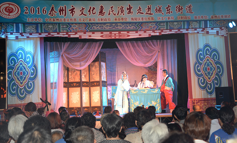 泰州市淮剧团6月16日晚(原定2016年5月31日,由于高考和中考延期)应海陵区城东街道文化站的邀请,文化惠民演出走进了城东街道鑫隆广场,初夏的天气虽然炎热,但是丝毫没有影响广大居民的欣赏热情,数千观众早早地就来到了演出现场抢占最佳的欣赏位置,将鑫隆广场座的水泄不通,短短两个半小时的演出,演员们在台上汗流夹背,一丝不苟,观众被演员执着的职业道德及精堪的专业表演水平所震撼,不时报以阵阵热烈的掌声给予鼓励。