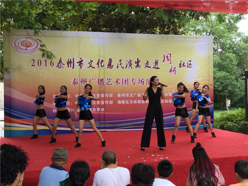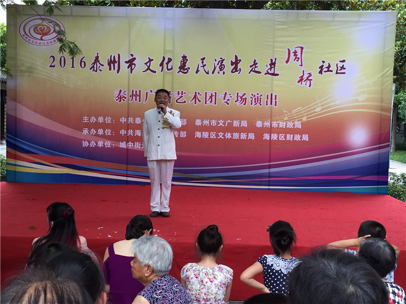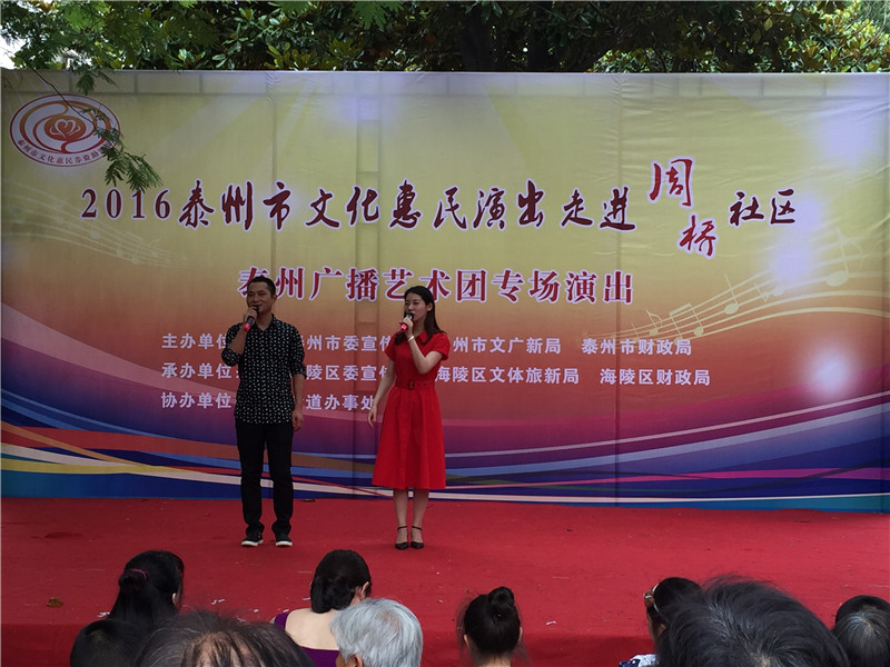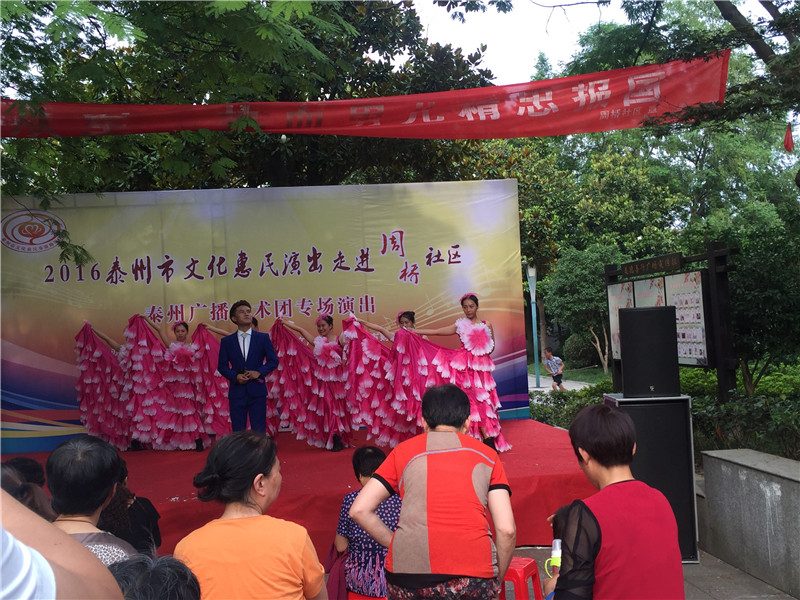 为庆祝中国共产党建党95周年,6月30日下午,周桥社区邀请了泰州广播艺术团来到周桥游园,给社区居民带来一场文化盛宴。