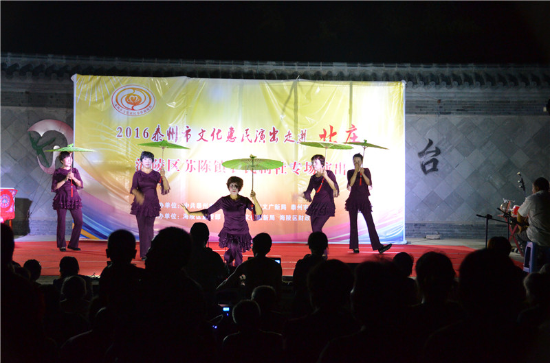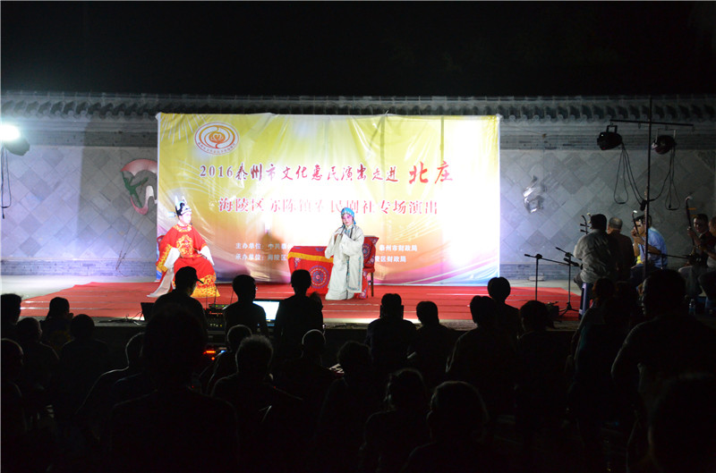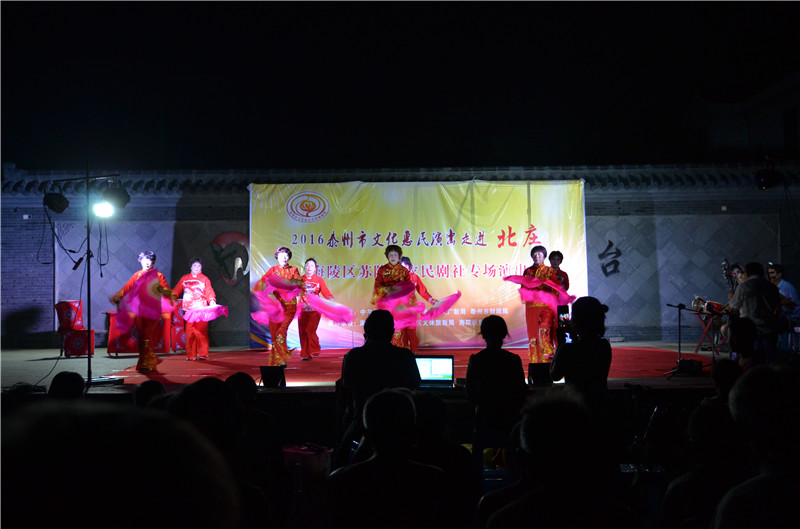 为丰富居民业余文化生活,7月29日晚,苏陈镇北庄村邀请泰州海陵区苏陈镇农民剧社为居民群众献上了一场精彩的文艺演出。晚上七点演出准时开始,广场上坐满了前来观看的居民。演出在舞蹈《恭喜发财》中拉开了序幕,此次文艺汇演有舞蹈、葫芦丝、表演唱、小品等节目,优美的乐声,动感的舞蹈以精彩的表演,不时赢来社区居民们的阵阵掌声。