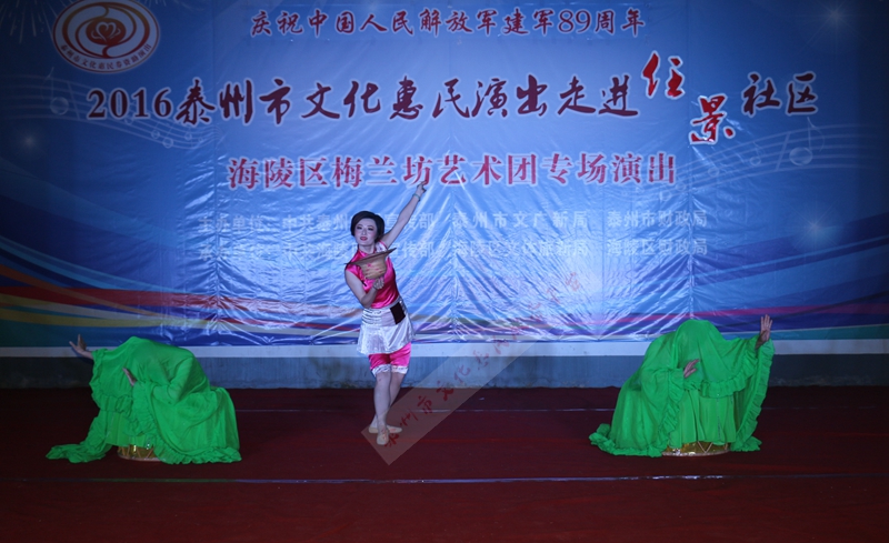 “军爱民民拥军,军民团结一家亲” 七月三十日晚上七点四十五分,庆祝中国人民解放军建军89周年暨泰州文化惠民券资助演出海陵区梅兰坊艺术团专场走进任景。演出在隆隆的大鼓声中开幕,紧接着歌舞、器乐、舞蹈、音乐快板、,小品、女声独唱、男声独唱、戏曲、童声小合唱、三句半等形式多样、内容丰富的节目纷纷登场。赢得了观众的阵阵掌声和叫好声。