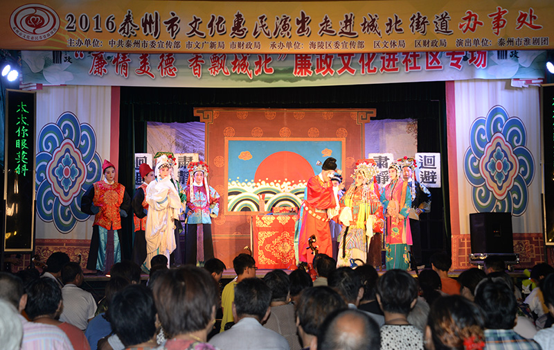 8月19日晚7:30分应海陵区城北街道办事处的邀请,泰州市淮剧团文化惠民演出走进城北街道滨河广场,为观众带来了一台优秀淮剧《唐知县审诰命》,虽然天气炎热但是丝毫没有影响观众的欣赏热情,演员们精湛的演技赢得了广大观众阵阵掌声,戏迷张先生说:“专业剧团表演水准就是高,欢迎你们团常来演出”。