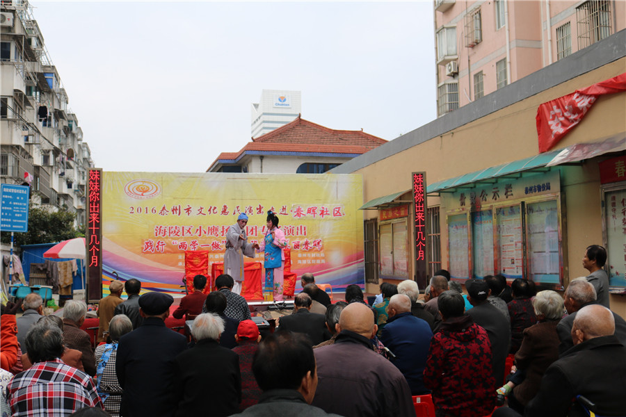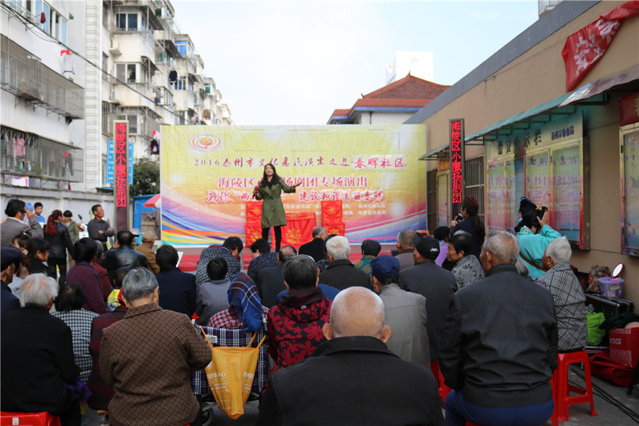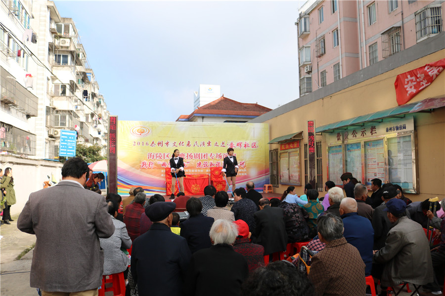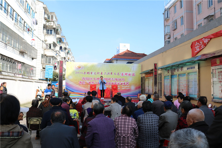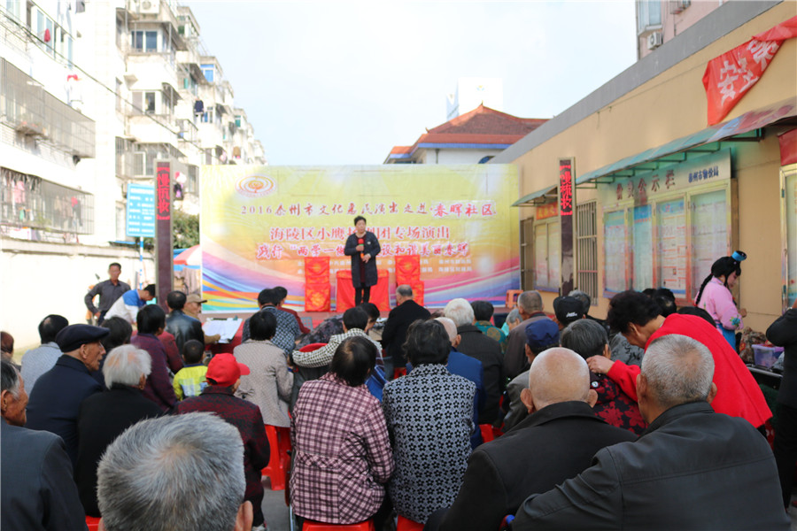 当天,泰州小鹰扬剧团的演员们早早来到社区活动广场,舞台布置、化妆、彩排,经过精心的准备,决心要给观众们带来一场精彩演出。很多居民吃过午饭早早的来到广场上,聚集在舞台的周围,现场气氛活跃,居民们脸上洋溢着笑容,其乐融融。这次泰州小鹰扬剧团的演出者们为社区居民们献上了非常精彩的扬剧《安寿保卖身》、《十八里相送》等,演员们精准的唱功,丰富的表现形式,赢得了台下戏迷和观众的连声叫好,大家欢聚在一起,尽享了一场文化盛宴。