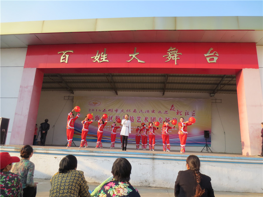 演出以舞蹈《中国梦》开场,整场演出青春活力、精彩纷呈,有独唱、戏剧、舞蹈、小品、三句半等,吸引了众多居民前来观看,台上精彩不断,台下掌声阵阵,丰富的节目将文艺演出推上了一个又一个高潮,表演在歌伴舞《好运来》圆满地落下帷幕,给在场的观众带来了一场别开生面的视觉和文化盛宴,大家在欣赏精彩节目的同时,更收获了一份浓浓的文化祝福。现场的群众个个都感叹如今农村的精神文化生活丰富了,表演走进社区,走进居民,居民们可以足不出户看到如此精彩的文艺演出,受到了居民们的热情欢迎。