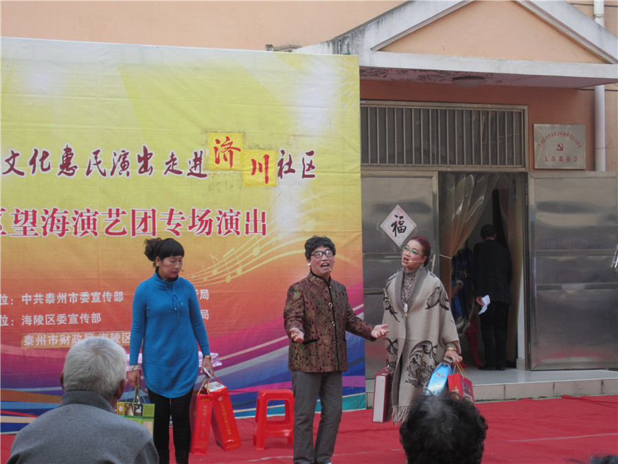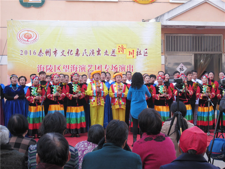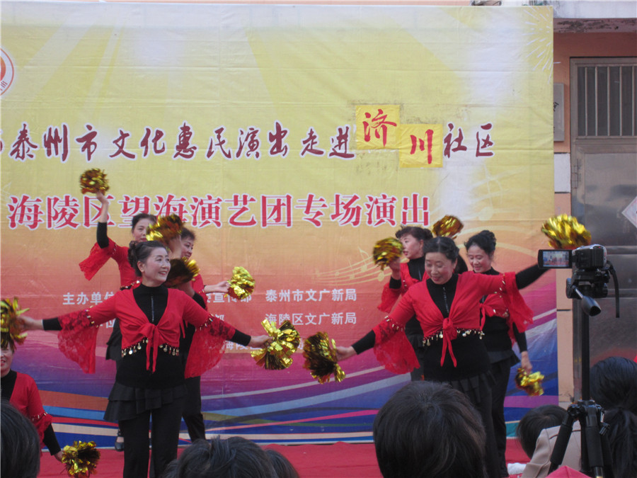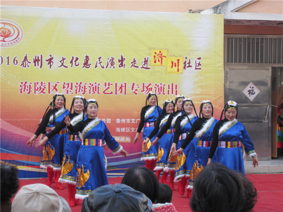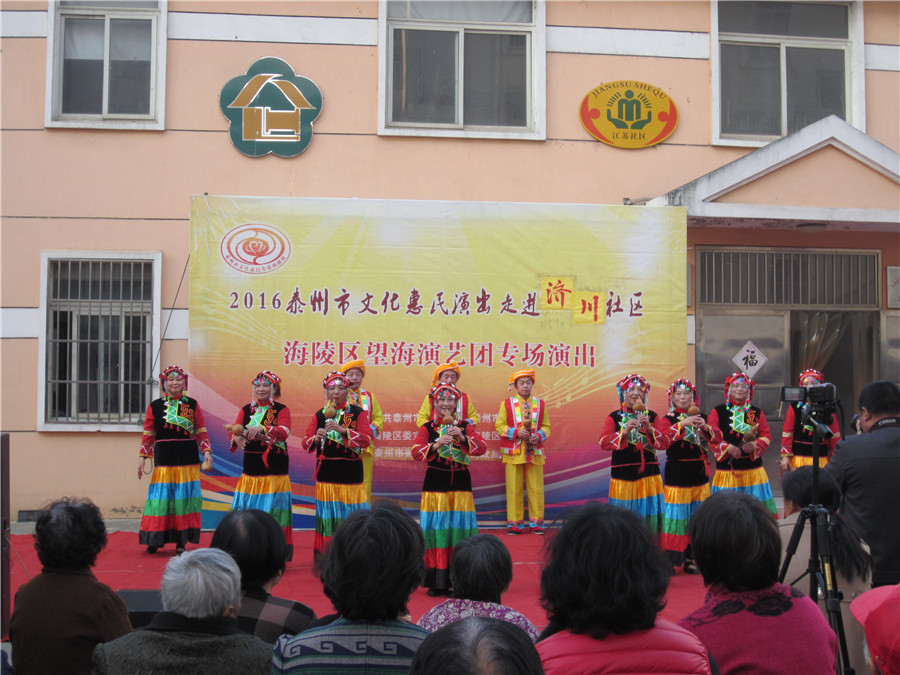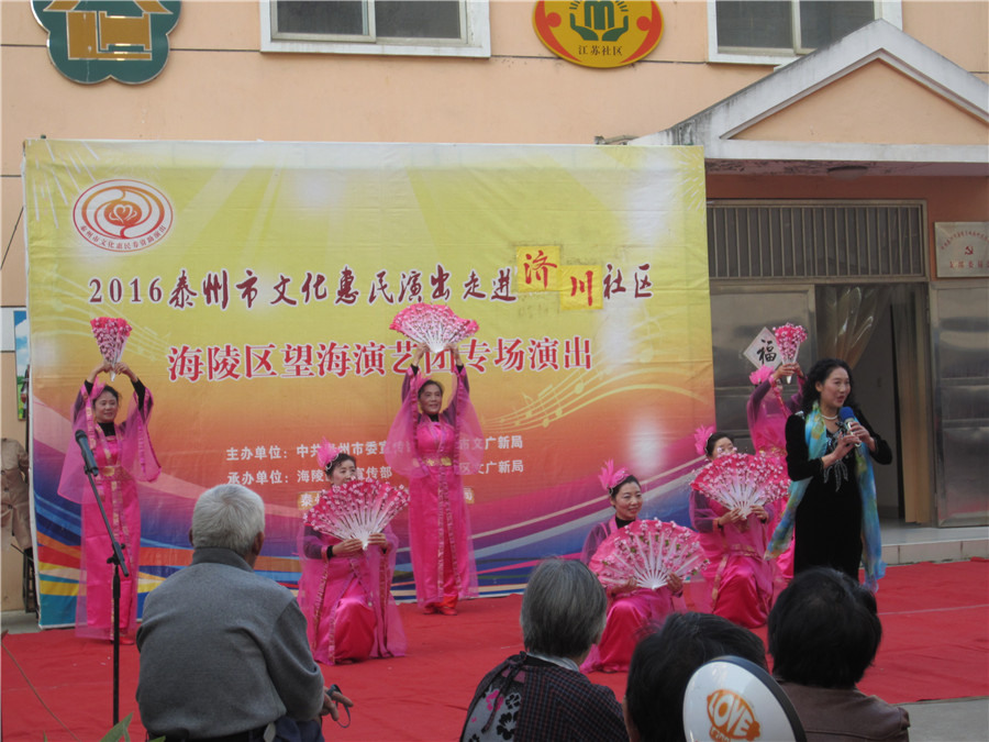 11月4日下午,海陵区望海艺术团走进济川社区,为居民们奉献了一场文化视觉盛宴。下午两点,居民们早早来到现场,伴随着舞蹈《中国梦》优美的音乐声,文化惠民演出正式拉开帷幕。现场演员们为大家表演了舞蹈《想西藏》、小品《可怜天下儿女心》、葫芦丝演奏《龙船调》、大合唱《走向复兴》等精彩绝伦的艺术作品,充分展示了扎实专业的表演功底和诙谐幽默的表演风格。获得了居民们热烈的掌声和欢呼声。
