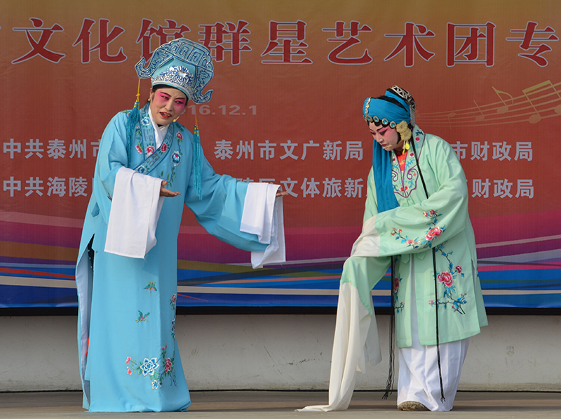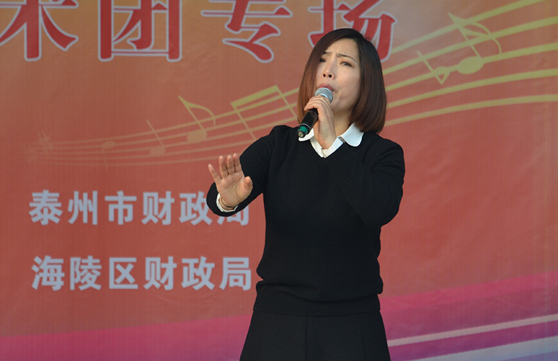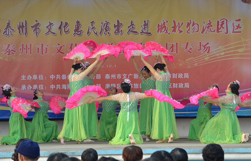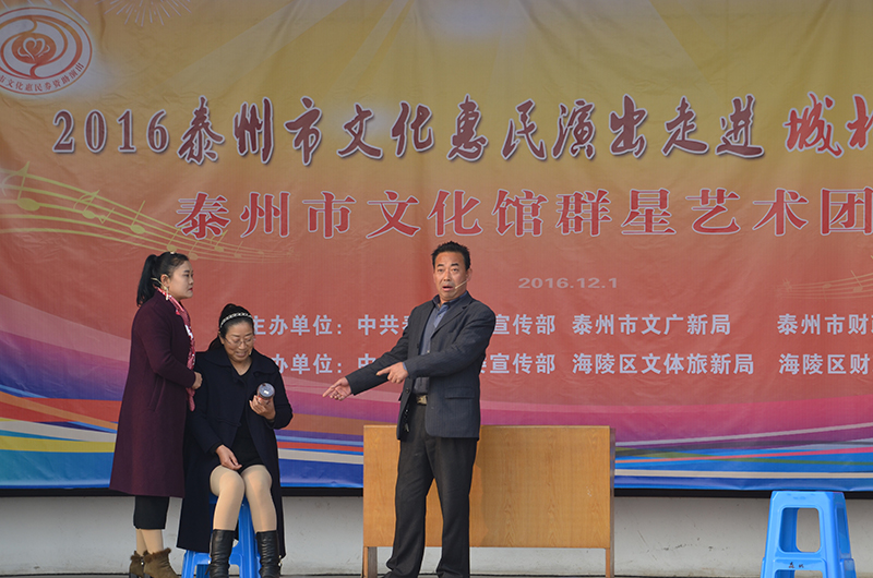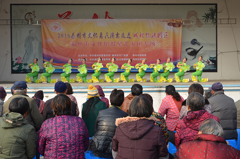 12月1日下午,泰州市泰州市文化馆群星艺术团惠民演出走进了城北物流园,给当地的百姓带来一场别开生面的演出。为了更接地气,让当地百姓看到他们想看的节目,除了有歌唱、舞蹈、二胡、小品之外,这次增加的百姓喜闻乐见的戏曲可谓多种多样,有淮剧《莲花庵》、《赵五娘》选段,越剧《十八相送》,还有京剧《光辉照儿永向前》等节目,百姓为演员精湛的演技拍手叫好。