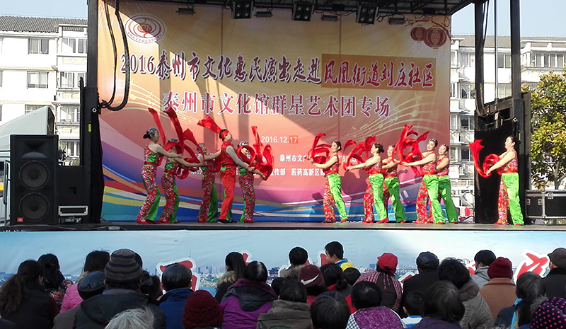 12月17日下午,泰州市文化馆文化惠民演出走进凤凰街道刘庄社区,为当地群众带了一场精彩的文化大餐。舞蹈《五星红旗飘起来》拉开了演出的序幕,一曲二胡独奏把观众带入到战马嘶鸣、风驰电掣、冲锋陷阵、顽强格斗的艺术情景之中,紧接着鼓韵说唱《牢记十要十不要》用通俗的语言讲述着一个文明市民的准则,顶缸表演精湛的表演更是让观众叹为观止,接着还有深受观众喜爱的京剧、淮剧以及魔术表演等节目,形式多种多样,最后在绚丽多彩的歌舞《盛世中国美》落下演出的帷幕。