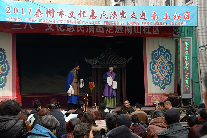 3月4日泰州市淮剧团应海陵区城中街道南山社区的邀请,文化惠民演出活动走进了南山社区鸿发小区广场,为广大的居民带来了一台我团保留经典淮剧《腊月雷》。两个多小时精彩的表演赢得了广大观众数十次掌声,证明此剧是受到观众欢迎的、是接地气的,习总书记在文艺工作座谈会上的讲话精神要求我们文艺工作者在创作上不能迷失方向,要多创作人民群众喜欢的作品;观众认可的作品才是接地气的好作品,今后我们加强新剧目的创作,继续扎根基层为百姓服务。
