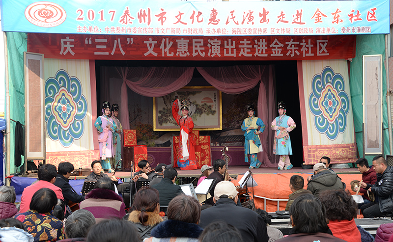 泰州市淮剧团3月6日应海陵区京泰路街道办事处金东社区的邀请,文化惠民演出活动走进了民兴中学南门广场;为社区居民带来了一台经典淮剧《赵五娘》,严谨的团风和过硬的演出质量赢得了现场数千观众阵阵掌声,扎实的唱功和专业的演技给观众留下了深刻的印象,两个半小时的演出对全团演职人员一丝不苟的工作作风也大加赞赏,我们将把这优良传统继承发扬光大。