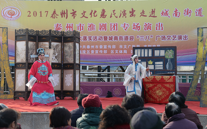 3月6日泰州市淮剧团应海陵区城南街道办事处的邀请文化惠民演出走进了莲花四区文化广场百姓大舞台,为广大的社区居民带来了一台优秀传统淮剧《赵五娘》;此剧是我团久演不衰的经典作品充满正能量的剧情加上演员扎实的基本功使现场观众不时传来阵阵喝彩声,这是对剧情及演员的肯定,今后将继续保持严谨的舞台作风为基层百姓服务。