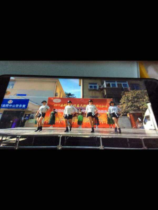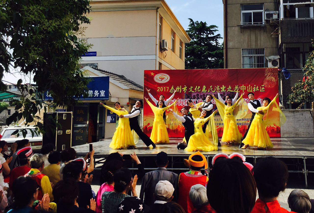 泰州市海陵区秋之声艺术团走进中山社区文化惠民演出。上午八点半午台音响工作人员进场搭建。午台9米乘8米。2017年5月25日下午三时准时在中山社区大楼门前广场进行。艺术团演员45人,观众100人,现场气氛热烈,掌声不断。艺术团主要节目午蹈美丽中国梦、模特走秀青春飞扬、男生四重唱少林少林、葫芦丝表演映山红、独午前门情思大碗茶等16个节目。受到现场观众和社区领导的一致好评。