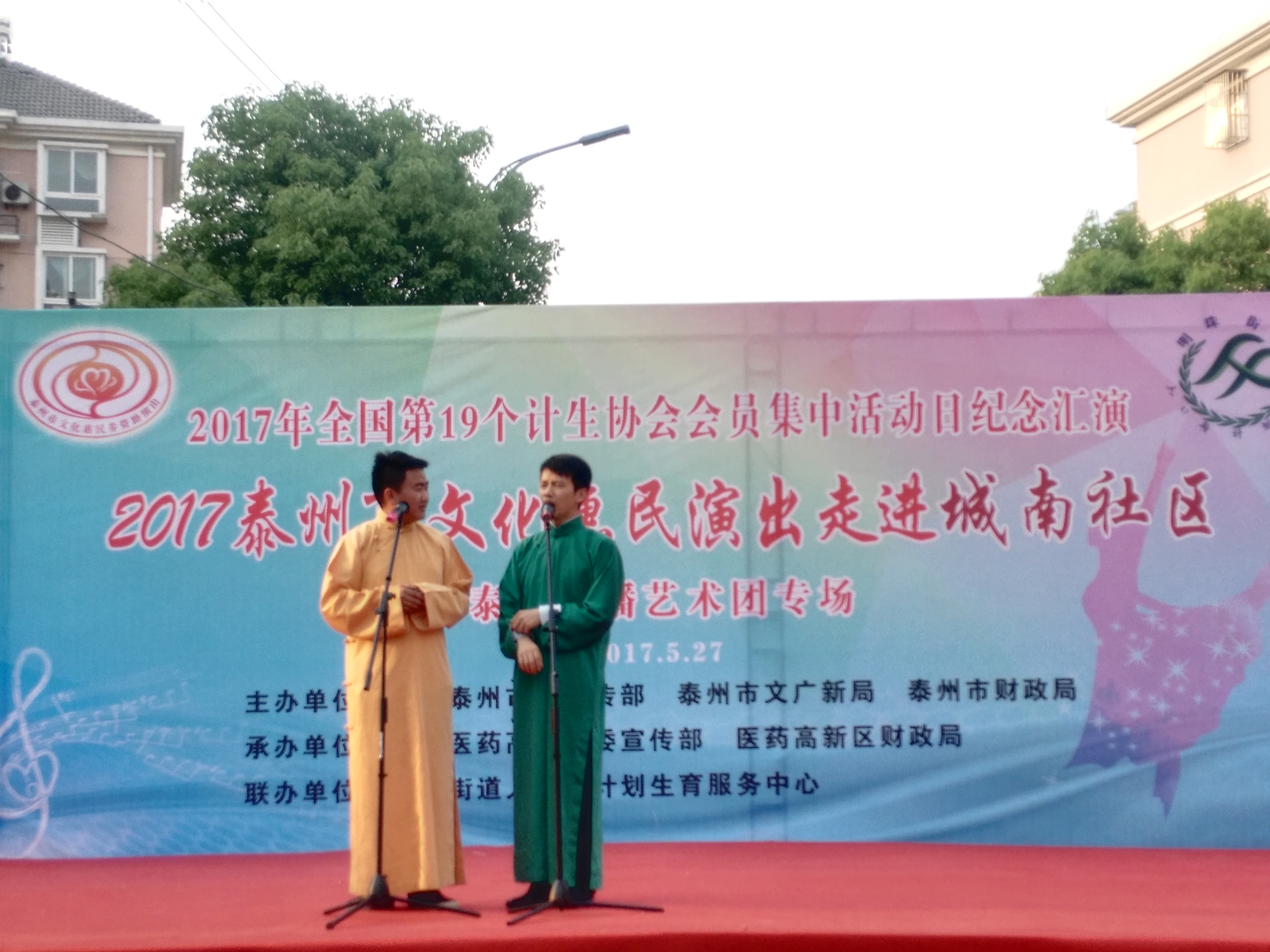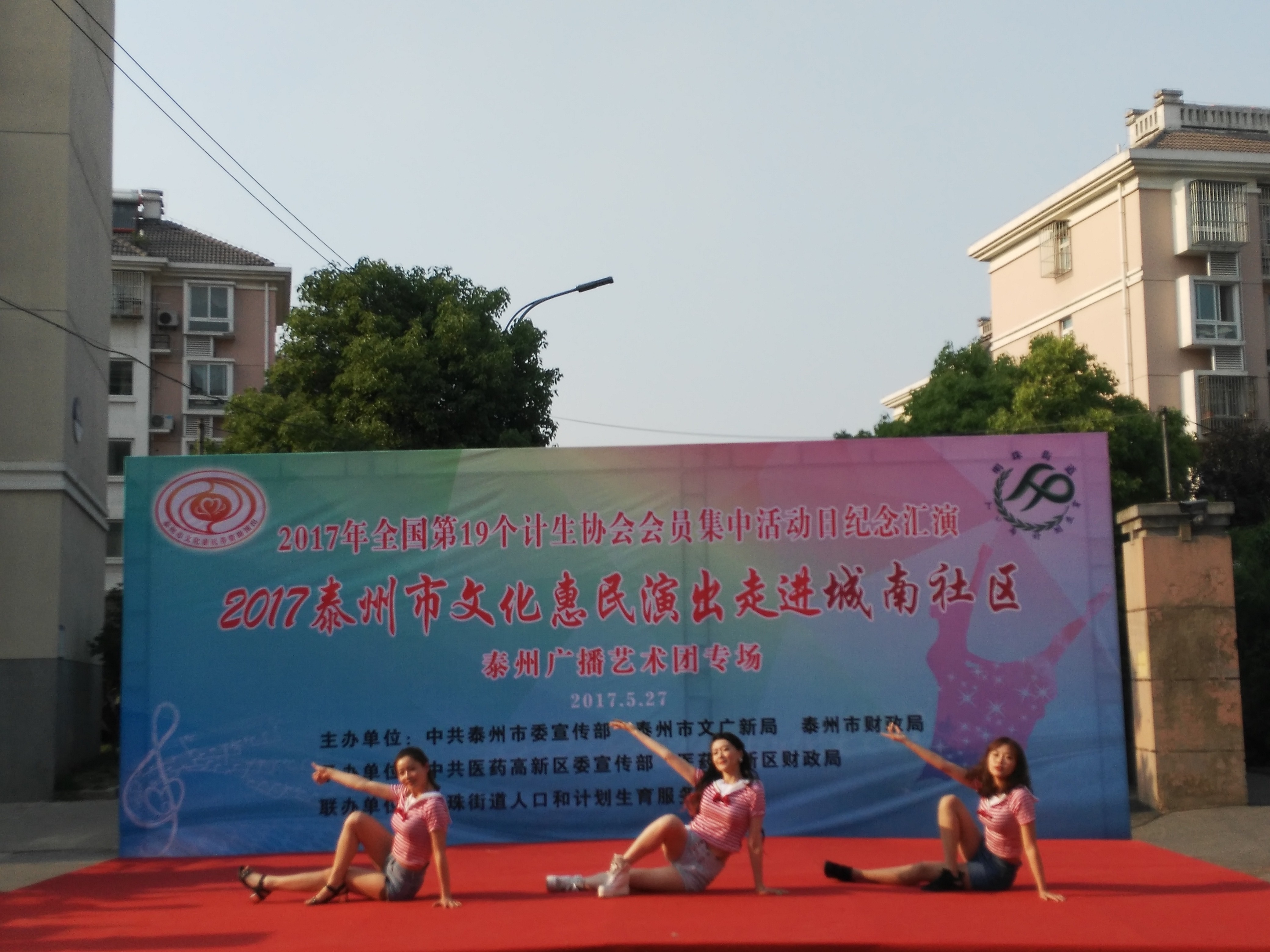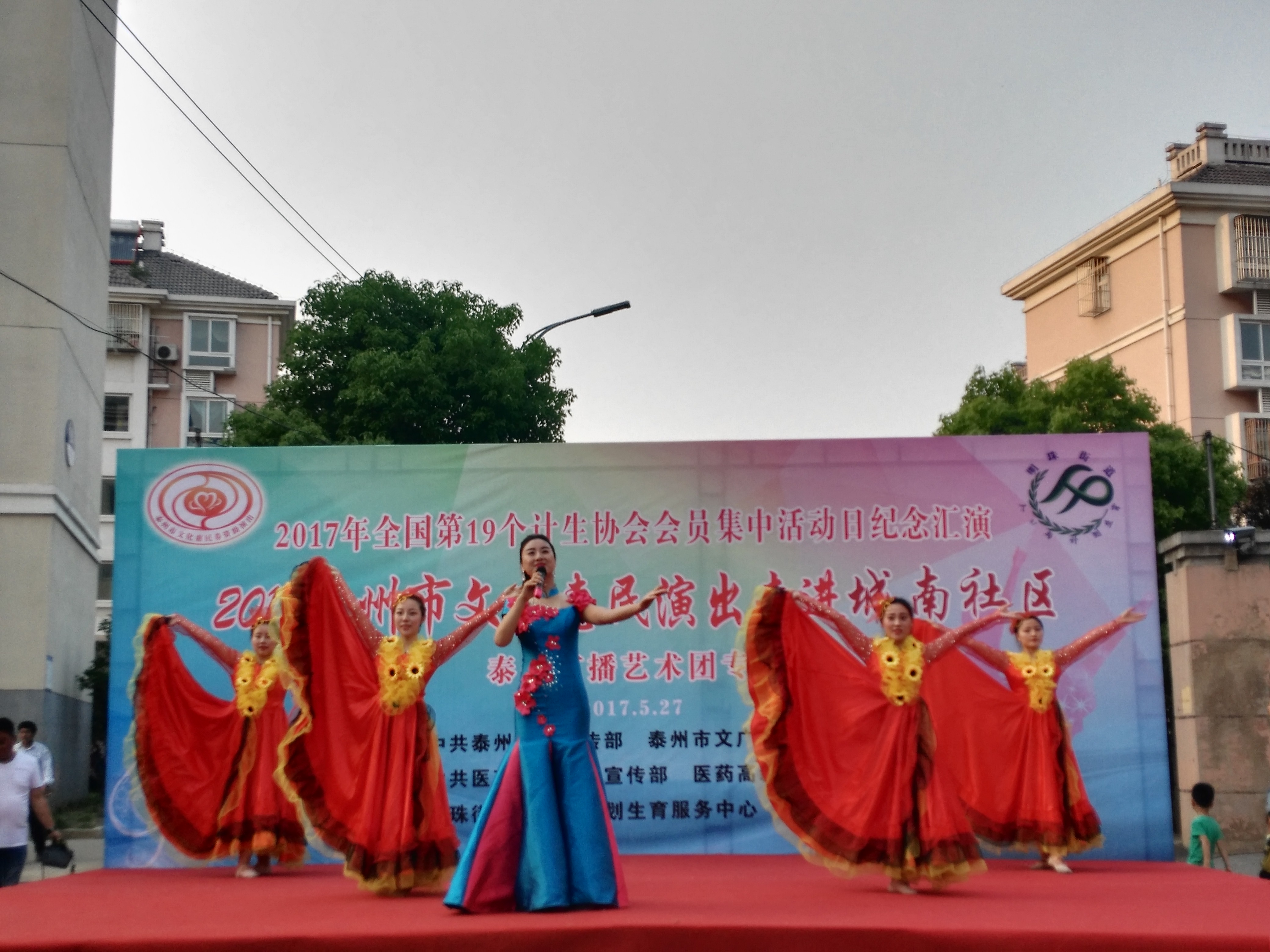 5月27号下午4时许,值此中国计生协会成立第37周年的纪念日前夕,2017泰州广播艺术团文化惠民演出走进城南社区,为那里的群众送去端午的祝福。当天是中国计生协会第19个会员集体活动日,本次集体活动的主题是“关注流动人口计生协会建设和服务”。 整个惠民演出节目精彩纷呈,开场民乐合奏《喜洋洋》、歌伴舞将现场点燃。电声管独奏令人眼前一亮,小丑互动让孩子们满载而归。动感热舞、快板说唱将气氛推向高潮,相声小品更是笑翻全场。优美的歌曲、火辣的舞蹈,泰州广播艺术团的表演赢得了观众的阵阵掌声。据了解,泰州广播艺术团是今年文化惠民演出中唯一的四星级演出团体,其中,来自泰州广播的一批优秀节目主持人,他们能歌善舞,能说会道,全明星阵容,受到市民的喜爱。泰州广播艺术团将秉承“真心爱民、善待百姓,真心为民、造福百姓”的民生担当,有力推动基层文化繁荣建设。目前演出区域确定在海陵区、高港区、姜堰区、高新区下辖的街道、社区、镇村,预计承担100场左右演出任务。