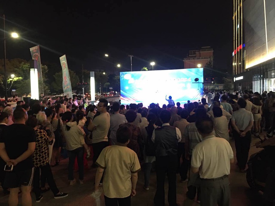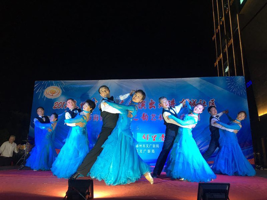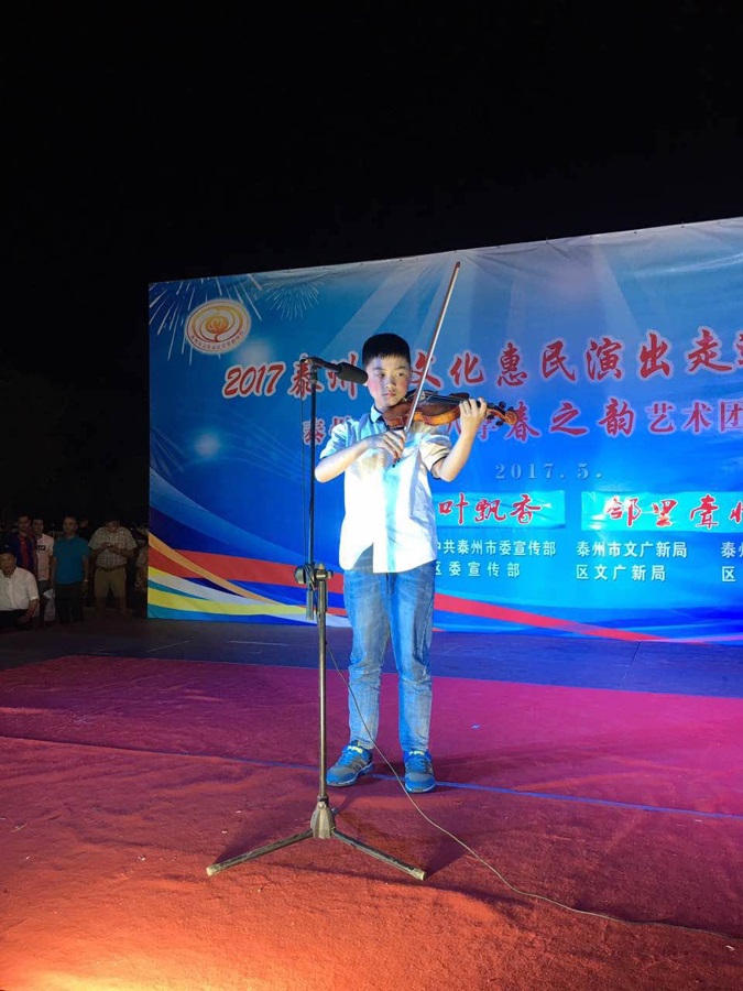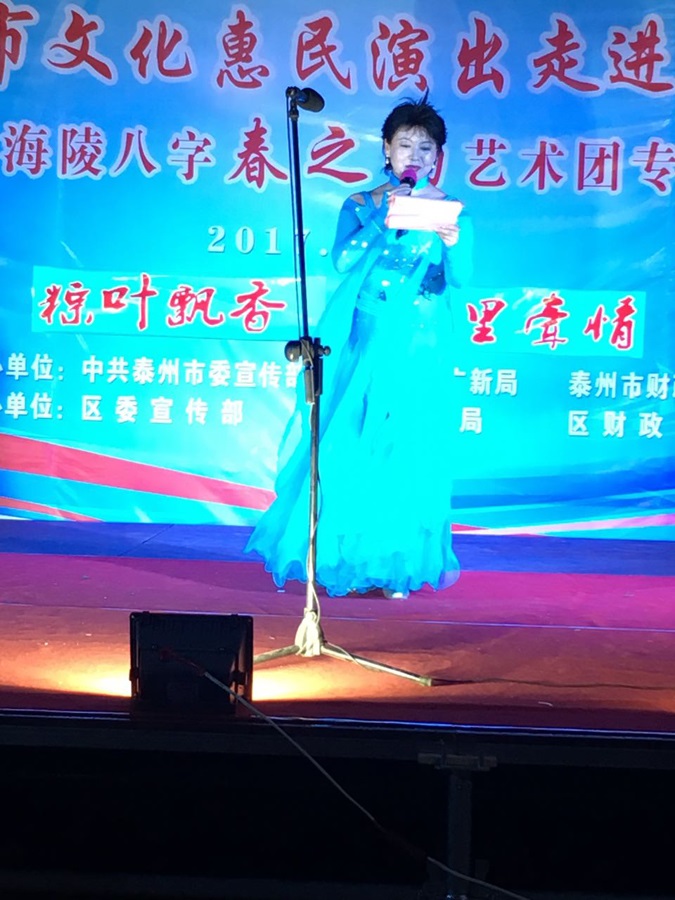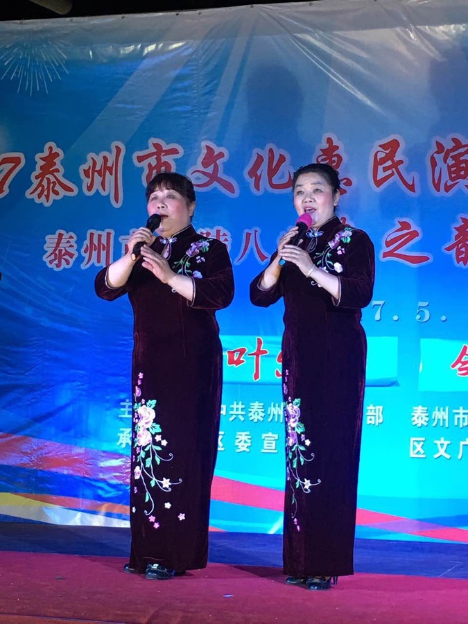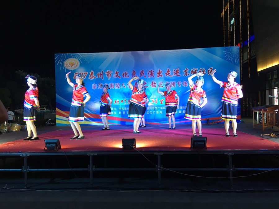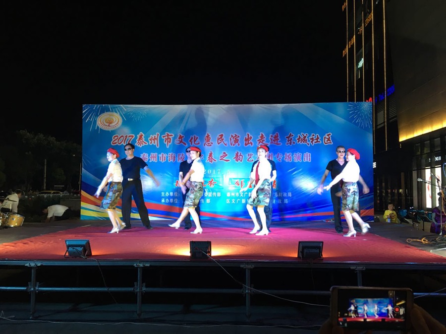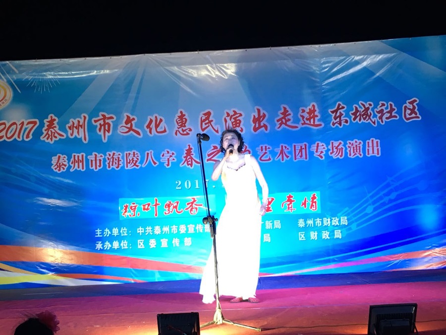 海陵区八字春之韵艺术团走进东城社区,5月27日傍晚,海陵区八字春之韵艺术团在海陵商业中心茂业天地南广场,首场惠民演出。七时三十分准时开场,二十人的乐队,中西合璧,奏出江南丝竹的优美和电声管乐的气势。三十余名演员,最小十一岁,年长者七十七岁,近二百名观众欣赏了器乐合奏,独奏,歌曲,戏曲和午蹈,表演者充分展示才气,观众兴高彩烈。有观众说,惠民演出我看了不少,像这样有水平的不多,社区满意,观众叫好,演员心慰。良好的开端予示着更好的未來。最后,全场互动高歌(我们走在大路上),整台表演100分钟,在欢呼和掌声中结束。