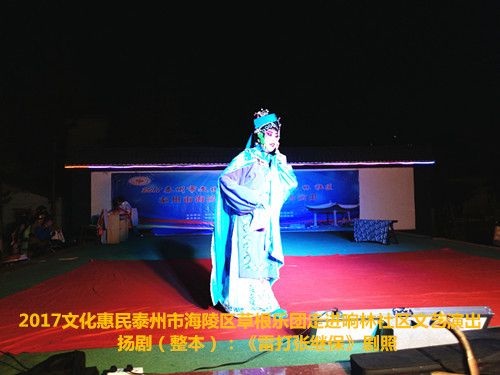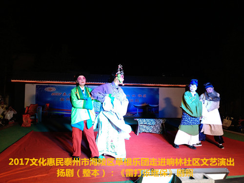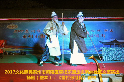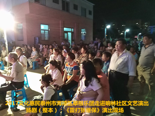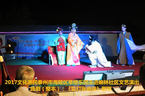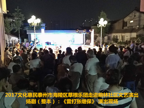 2017年6月2日晚6点半泰州市海陵区草根乐团在团长邰荣的带领下走进京泰路街道响林社区文化惠民演出,今天草根乐团给社区的居民朋友们带来了整本扬剧《雷打张继保》,演出时间整整三个小时,该剧情节跌宕起伏,喜怒哀乐情感丰富,演员舞台上精彩的表演赢得了观众一阵阵掌声,直到演出结束后还有许多观众沉浸在剧情之中,精彩的演出获得了社区居民群众的好评。