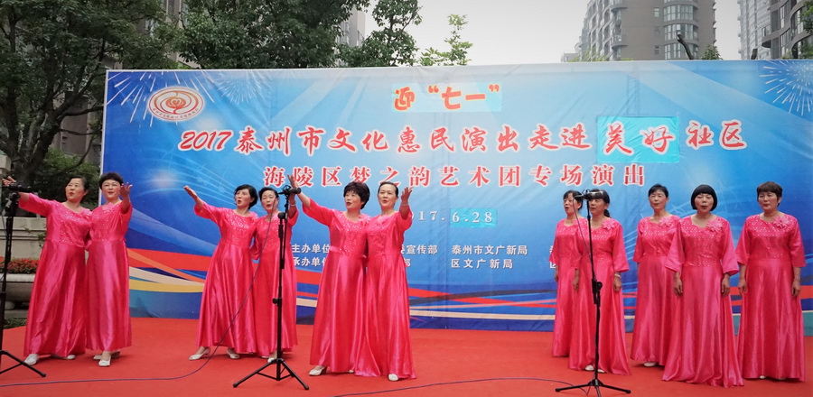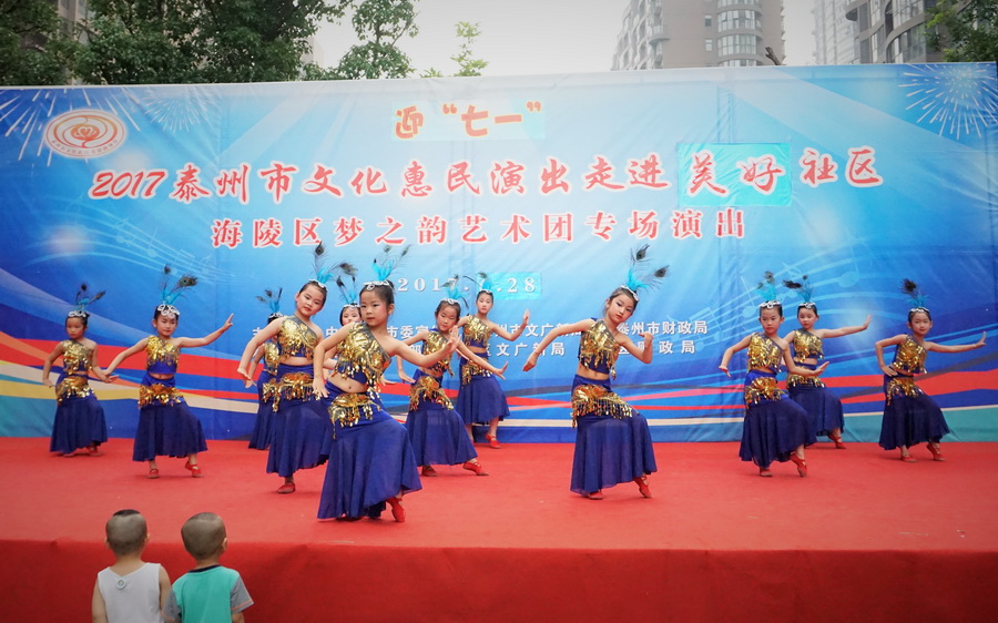 2017年6月28日下午,应城南街道美好社区邀请,海陵区梦之韵艺术团走进美好上郡小区,为美好社区的居民带来一台精彩的文艺演出。当天下午,铺着大红地毯的舞台搭建在美好上郡小区东大门,大批社区居民纷至沓来,居民们对这台演出表现出极大的热情和期待,没有坐的就自带凳子,或干脆站着,观众里三层外三层的簇拥在舞台前,形成一幅非常壮观的观众场面.......。演出如约开始,整齐的演员阵容,惊艳的荟萃节目、柔美的婀娜舞蹈、美妙的专业演唱、青春的动感街舞,诙谐的幽默小品.......博得观众阵阵掌声,110分钟的演出在观众的热烈喝彩声中华丽落幕......。
