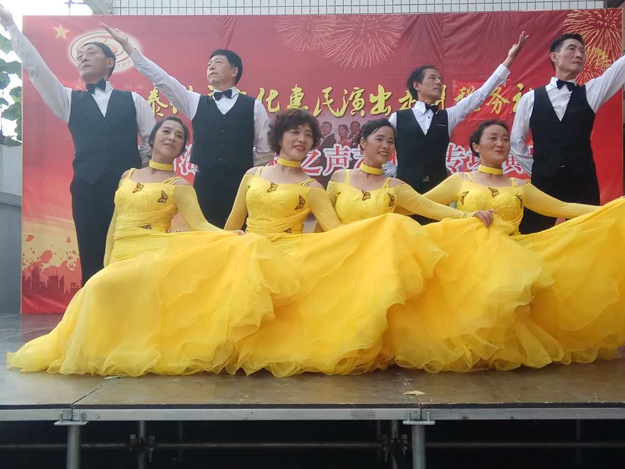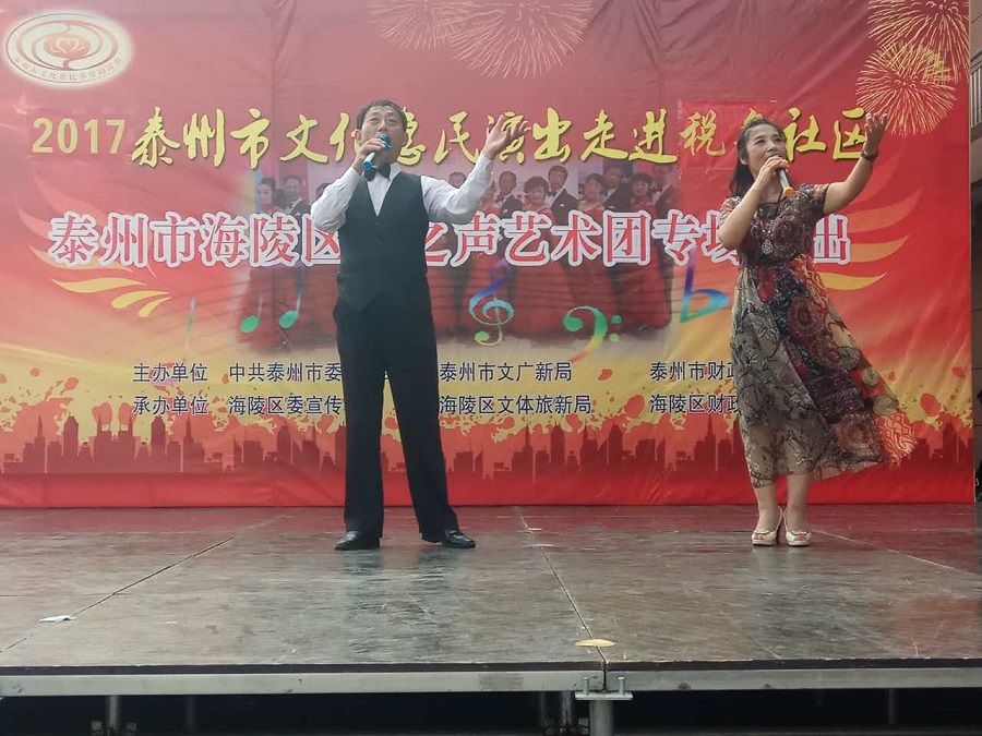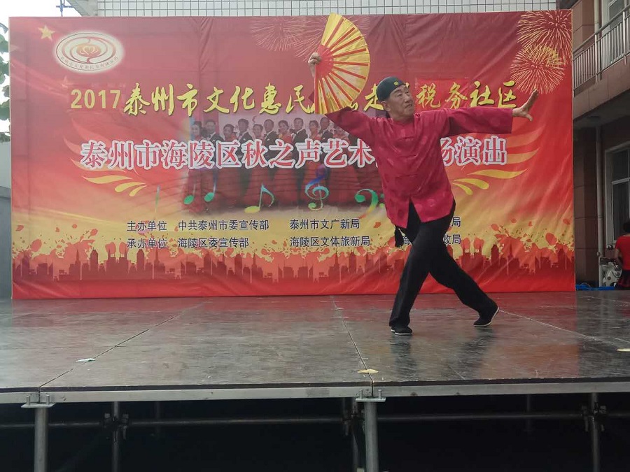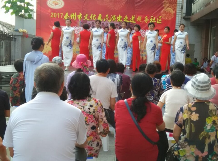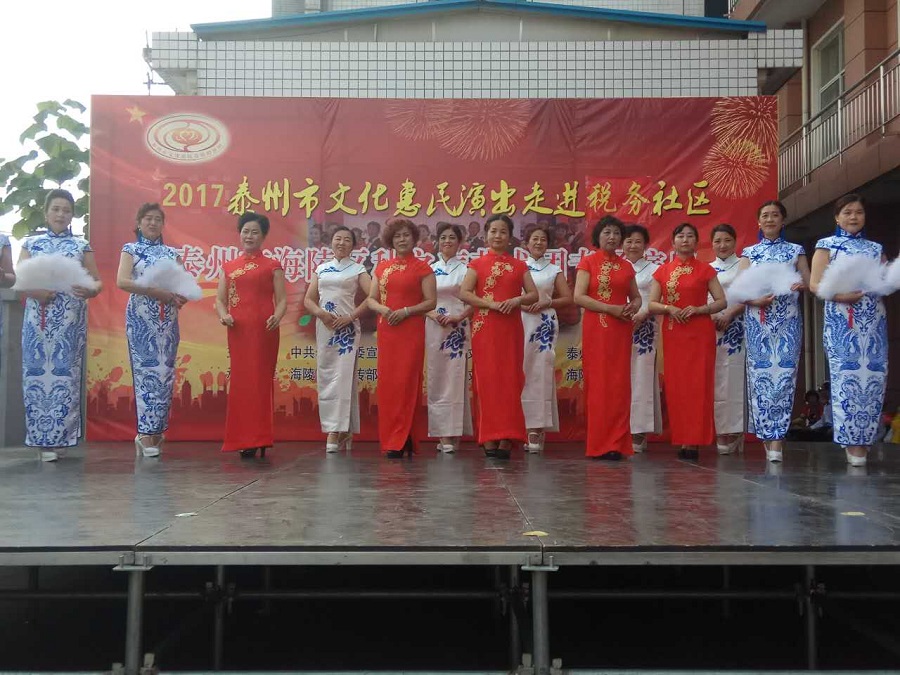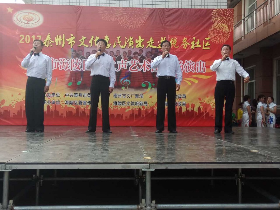 六月二十九号下午三点,泰州市海陵区秋之声艺术团应泰州海陵区城中街道邀请惠民演出走进税务社区。当日下午在该社区广场观众达一百多人。该团舞蹈美丽中国梦、走秀远方的思恋、男声四重唱少林少林、葫芦丝合奏映山红等精品节目。全场掌声不断欢声雷动,把演出推向高潮,当谢幕曲难忘今宵奏响时,观众依依不舍,整场演出给社区、观众留下了良好的印象。