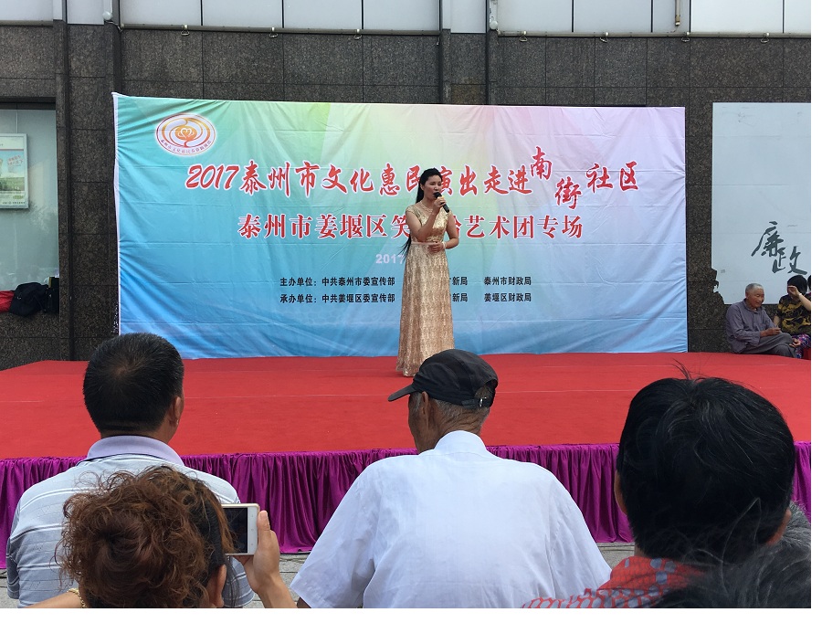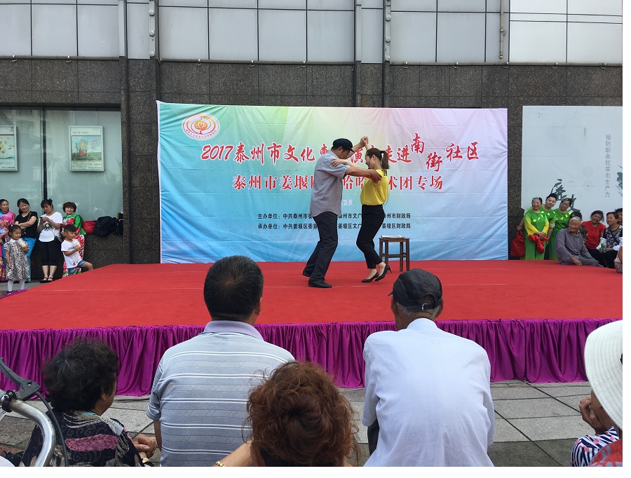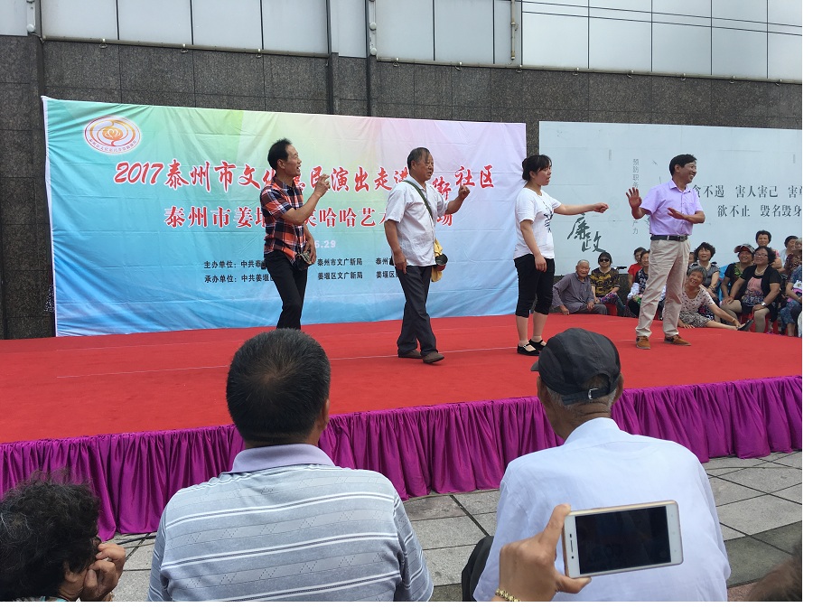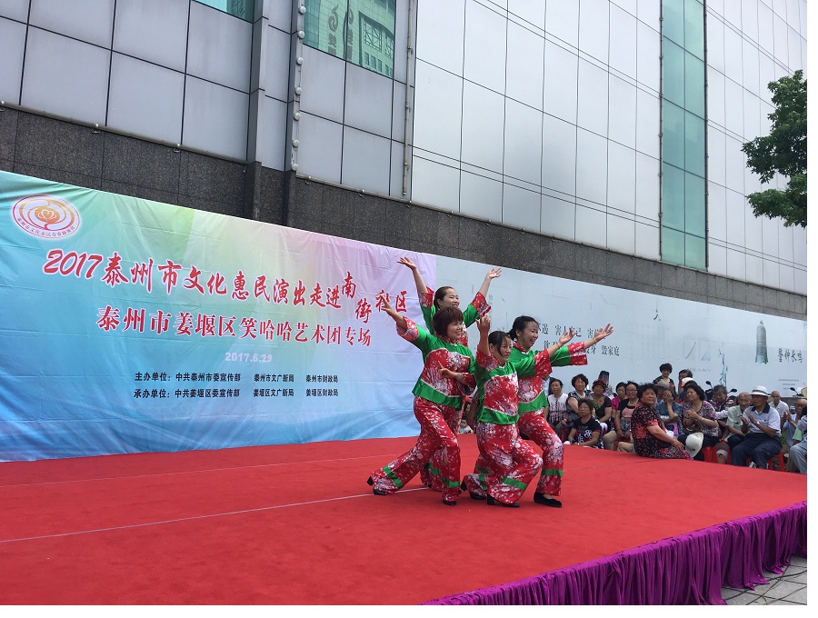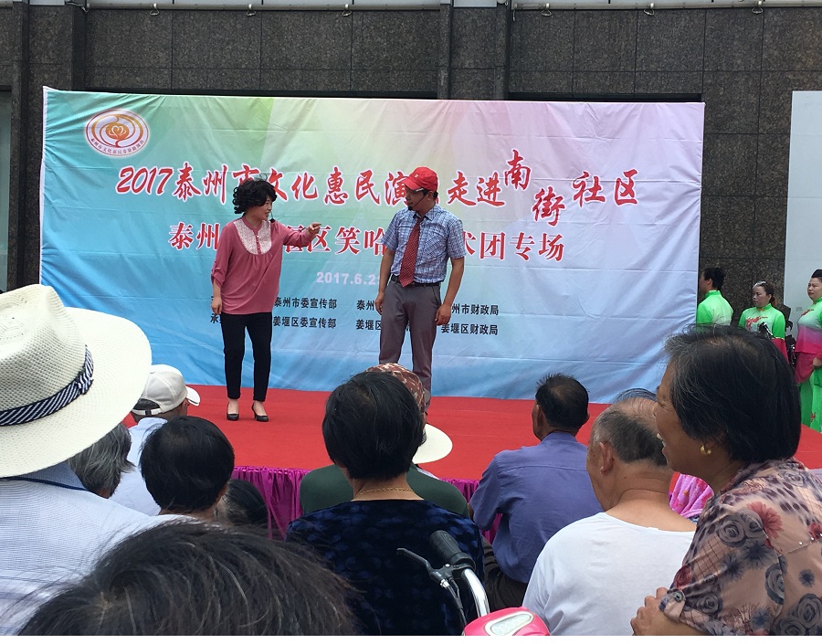 6月29日,姜堰区笑哈哈艺术团文化惠民专场演出走进罗塘街道南街社区。下午2点演出在坝口工行东侧准时开始,现场表演的节目有舞蹈《红红火火大中华》、莲花落说唱《莲花一打笑哈哈》、方言韵白《洗澡》、萨克斯演奏《北国之春》、方言韵白《拐过弯来是幸福》、天津快板《有话好好说》、相声《趣说泰州话》、越剧梁山伯与祝英台选段《十八相送》、表演唱《财政惠民乐农家》、以及独唱等11种形式、12个节目。整台演出时长115分钟,观众约800人左右。节目形式多样、内容丰富,尤其相声、快板、喜剧小品、方言韵白等语言类特色节目赢得了观众的阵阵笑声和掌声,受到了社区干部、群众的一致好评。