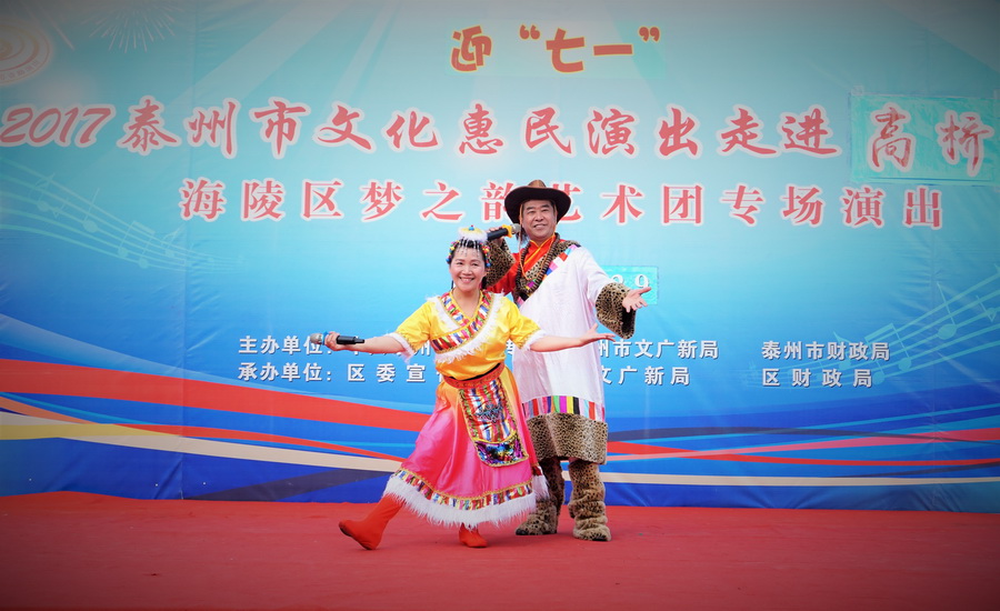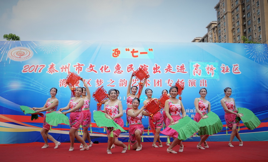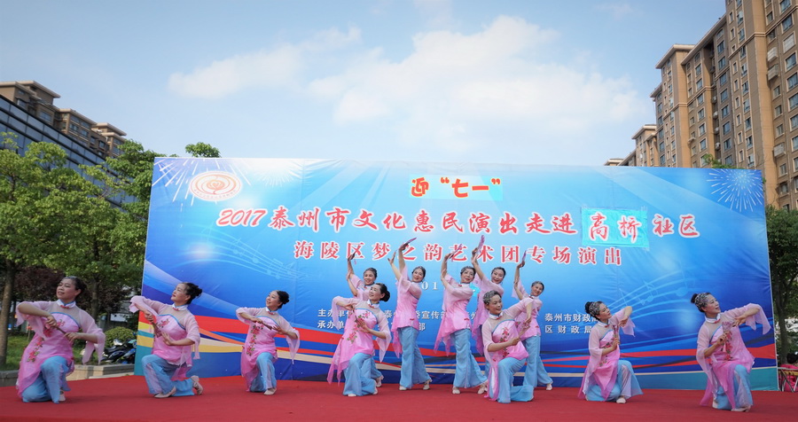 2017年6月29日下午,位于城区中心的铁塔公园里人头攒动,热闹非凡,一铺有大红地毯的舞台横空出现,舞台背景上的“庆七一”红色大字格外醒目,应城中街道高桥社区邀请,海陵区梦之韵艺术团今天走进高桥社区,为社区居民展示精美的文艺大餐。为惠及周边居民,梦之韵艺术团将演出舞台搭建在铁塔公园里.......,欢快喜庆的《中国结》,古朴俏皮的《俏晨曦》、千妖百魅的《梨花情》、轻步曼舞的《桃花扇》、正气凛然的《绣红旗》、激情演绎的《党啊,亲爱的妈妈》、异域风情的《凉凉》、青春劲爆的《炫舞青春》、捧腹逗乐的《卖鸡蛋》.....,靓丽的舞台、悦动的音乐、倾情的演员、热情的观众,为铁塔公园增添一道独特的风景.....。