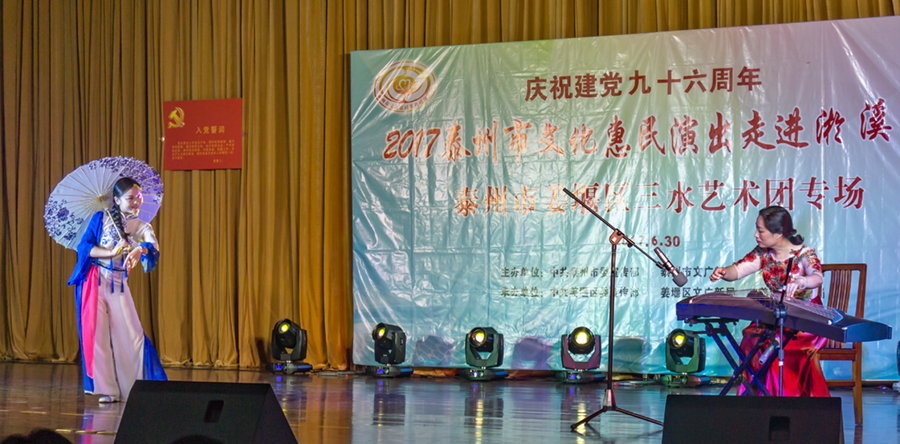 7月1日上午,淤溪镇党委、政府在该镇文体中心大会堂召开庆祝大会,庆祝中国共产党成立96周年。特邀姜堰区三水艺术团赴会并参加演出。此次演出政治喜庆氛围十分浓厚,艺术团领导相当重视精心准备,挑选本团精品节目,奉献给淤溪镇的党员代表。参演的13个节目内容丰富、形式多样。有民乐合奏、独奏、锡剧、京剧、独唱、小品等等。整场演出围绕中心,贴近群众的生活。观众反映很好。与会代表说三水艺术团实力不一般,演出阵容强大,在庆"七·一"大会上,给我们淤溪的老百姓送来了丰富的精神文化大餐。演出时长100分钟,观众近800人。
