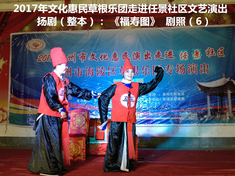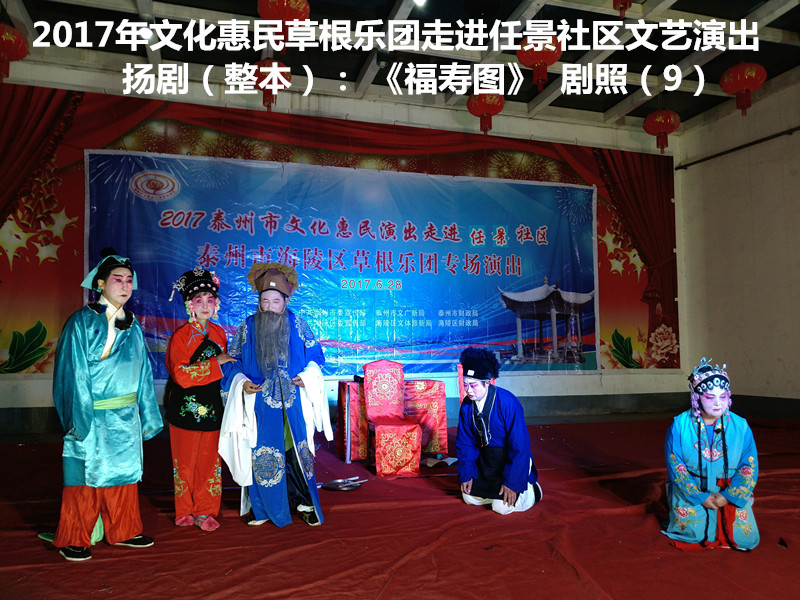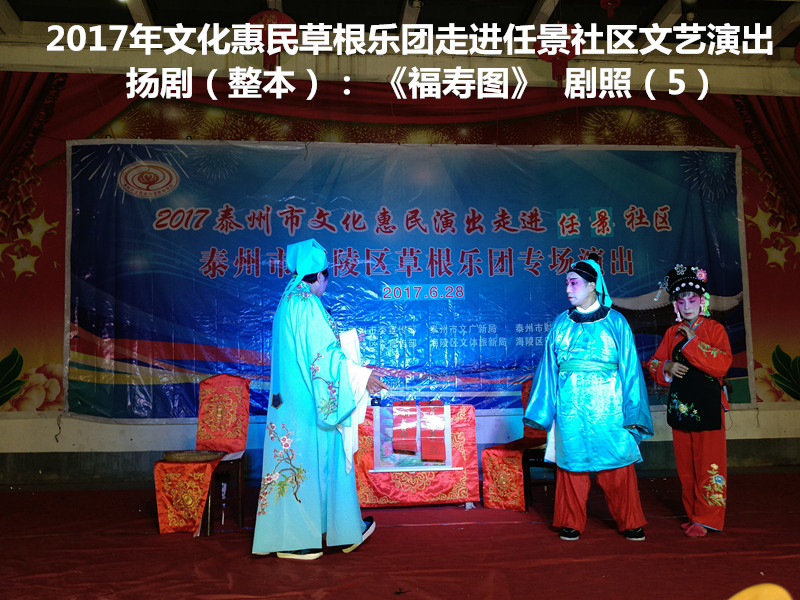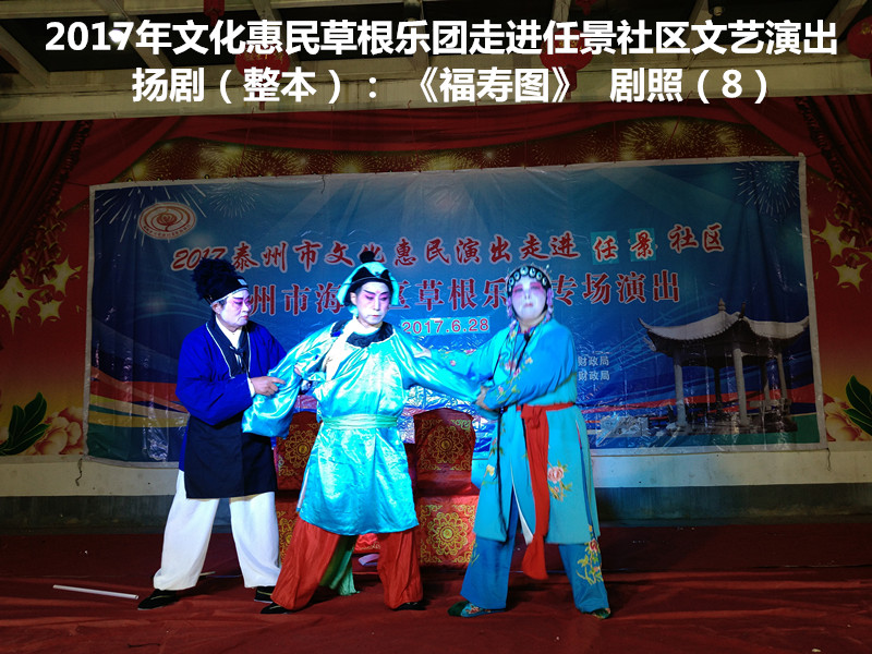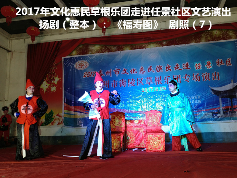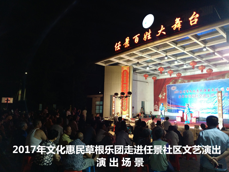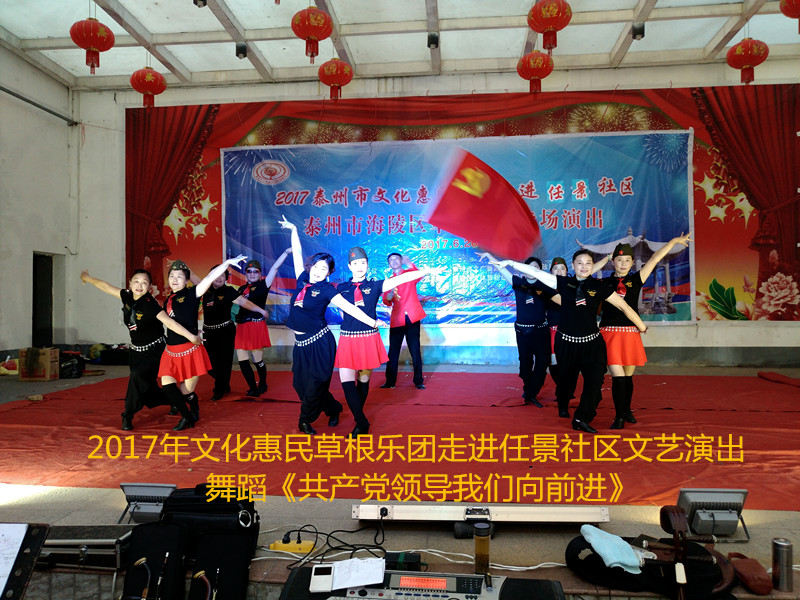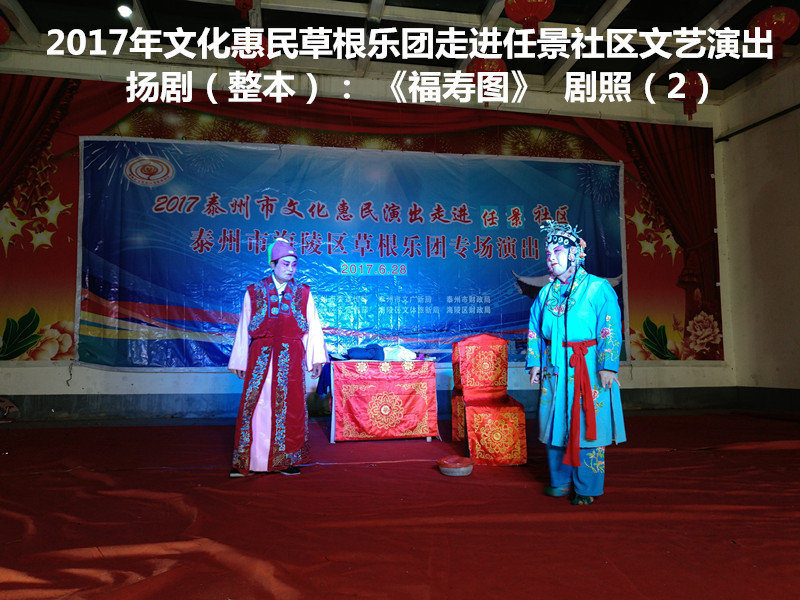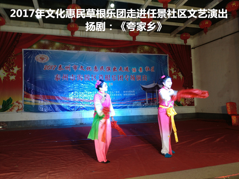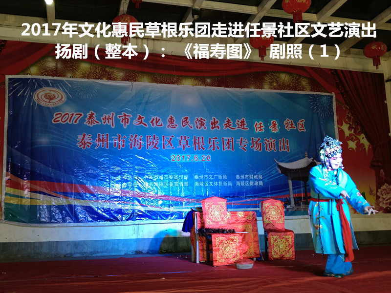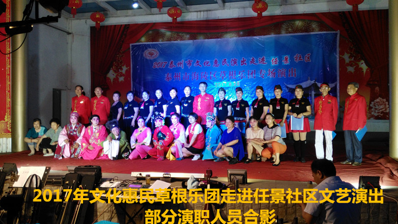 2017年6月28日泰州市海陵区草根乐团应邀来到美丽的任景社区,承办2017文化惠民走进任景社区的文艺演出,按照点单要求我团演出整本扬剧《福寿图》,就在演出的前一天社区领导希望我们结合庆祝建党96周年增加部分节目,我团立即按要求组织舞蹈队、声乐队另外增加了四个精彩节目,近三小时演出给观众带来了快乐,得到了社区领导和居民群众的赞扬!