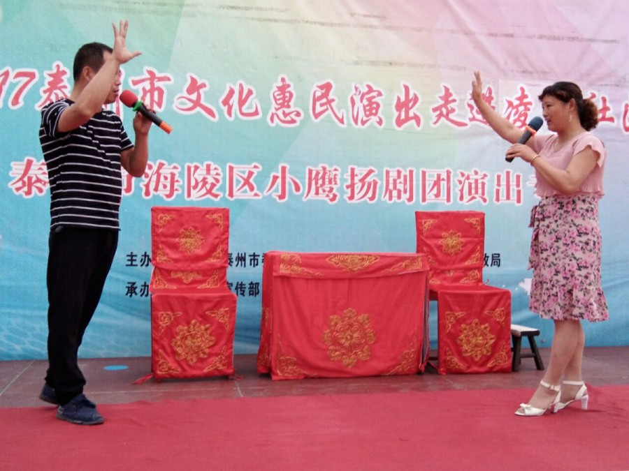 2017泰州市文化惠民演出走进海陵区京泰街道凌窦社区,海陵区小鹰扬剧团专场演出,2017年7月1日晚上在海陵区京泰街道凌窦社区篮球场成功举办。经典的扬剧折子戏博得了观众的阵阵掌声。演出结束后,观众迟迟不肯离场,应戏迷观众再三要求,团长又加场了几段扬剧经典的唱段。演出很成功!感谢社区领导提供全方位的服务!