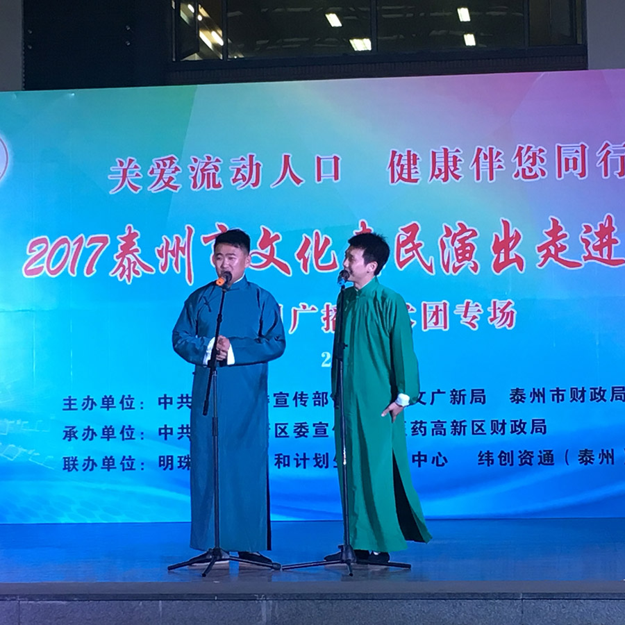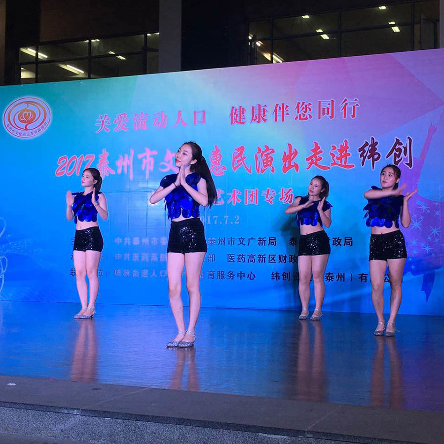 按照省委、市委关于文艺下乡的指示精神,为深入宣传科学发展观活动,推进文化惠民工程的开展,进一步丰富广大群众的文化生活,7月2日晚上六点,泰州广播艺术团主办了主题为“关爱流动人口,健康伴你同行”的文化惠民活动。泰州广播艺术团走进明珠街道纬创,并且精心编排了一台精彩的文艺节目,在纬创开展文艺汇演活动。在各级领导的高度重视和大力支持下以及全体演职人员的共同努力下,文艺演出通过舞台艺术活动的开展满足了广大群众日益增长的精神文化需求,丰富了纬创员工的文化生活,取得了良好的政治效益和社会效益。