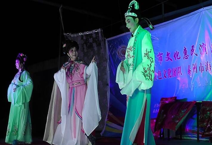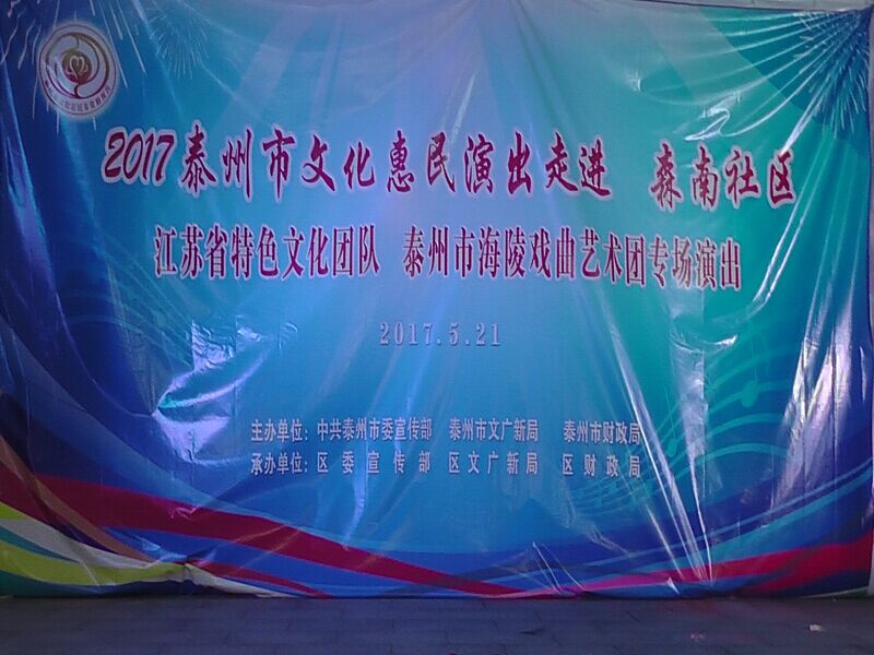 泰州市海陵戏曲艺术团于2017年5月21日晚19时30分在海陵区城西街道森南社区广场演出大型优秀传统扬剧——《逃婚的新娘》。我团参演人员25人。由于森南社区积极宣传,前来看戏的群众400余人,人民需要文化,文化需要人民,演出现场气氛热烈,观众掌声不断,演出圆满成功。这更加激起我们为老百姓排好戏、演好戏、唱好戏。让泰州市文化惠民演出活动锦上添花,更上一层楼。