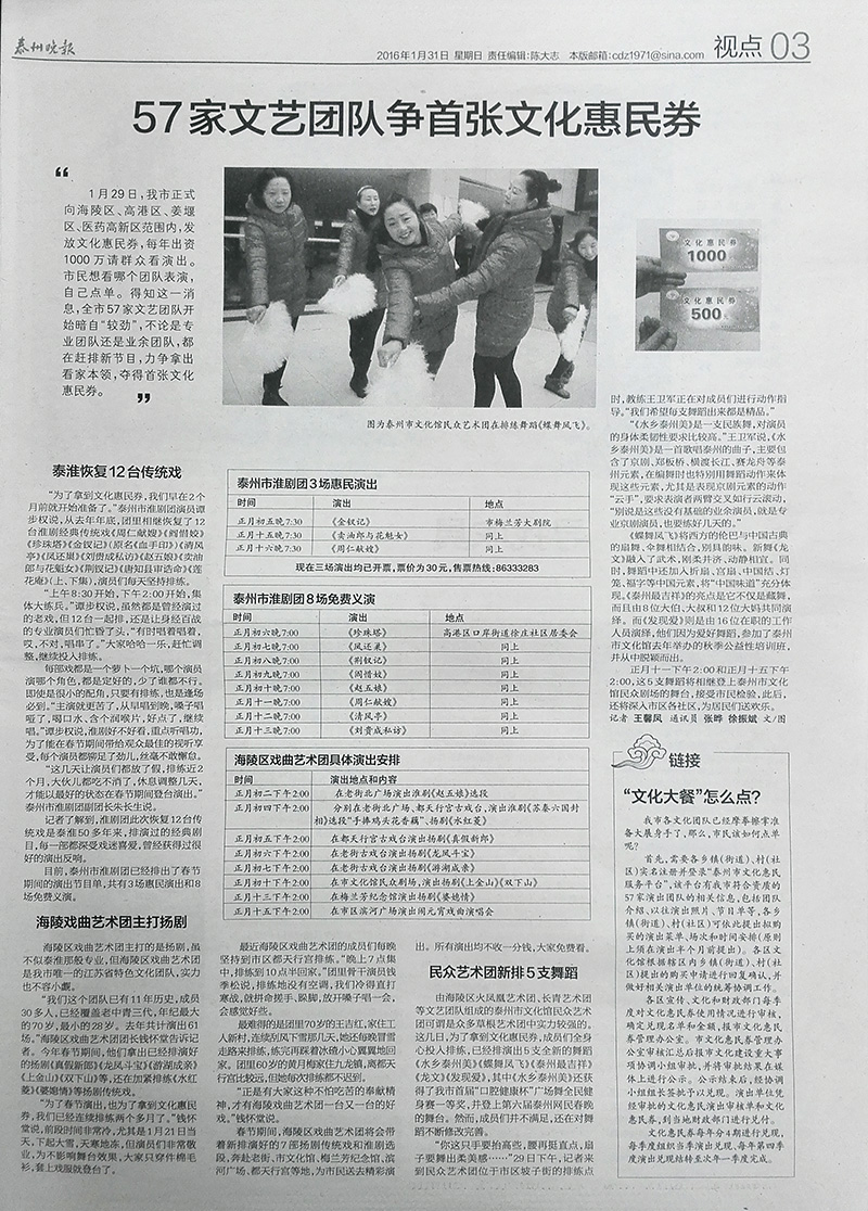 发布时间: 2016/2/1 15:50:00 被阅览数: 226 次 来源: 泰州文化惠民服务平台