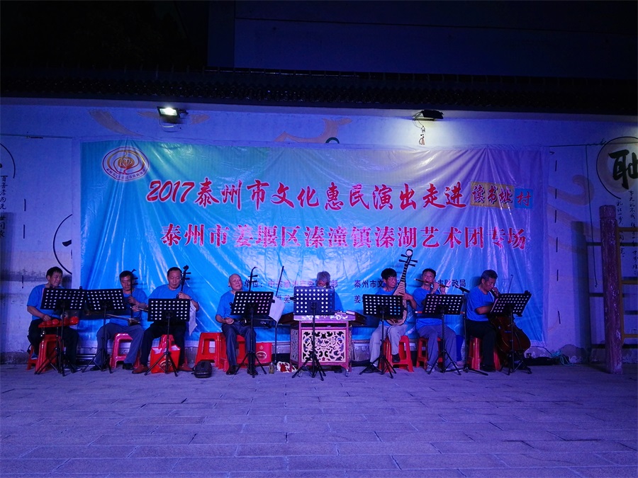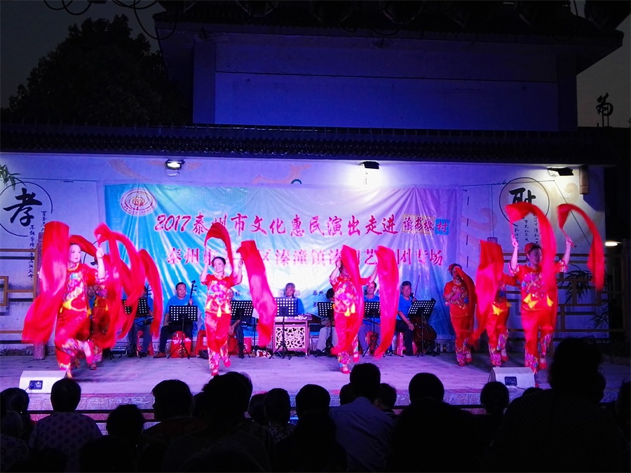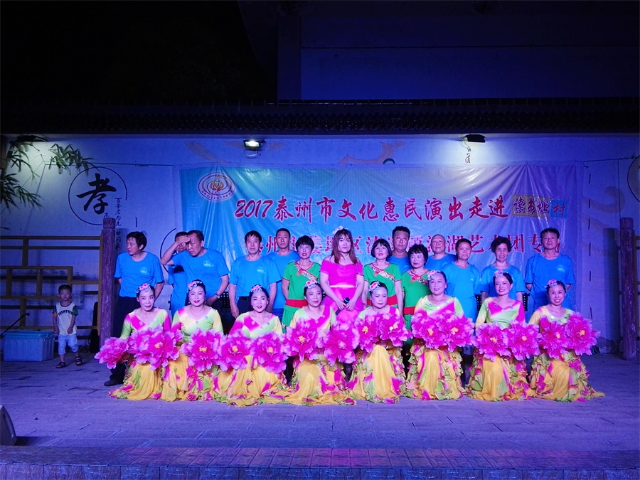 7月10日,姜堰区溱潼镇溱湖艺术团应溱潼镇读书址村邀请,2017年泰州市文化惠民券专场演出于当晚7点三十,在读书村址村百姓大舞台上演。为适应观众不同层次的文化欣赏需求,溱湖艺术团精心策划了16个丰富多彩的文艺节目,随着欢快喜庆的音乐响起,舞蹈《红红火火大中华》拉开了演出序幕,当晚演出不仅有激情奔放的民歌与民舞,还有童星,而且有耳熟能详的戏曲,淮剧《手捧枝头花香藕》,还缴请当地群众上台表演,最后在舞蹈《走向复兴》结束晚会,整台演出效果好,弘扬社会正气,倡导诚实守信,气氛热烈,掌声不断,赢得了广大观众的一致好评。当天晚上演出时长100分钟,观众达到500多人,优美而精彩的表演,给读书址村民送去一份丰盛的文化大餐。