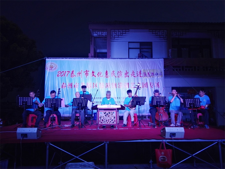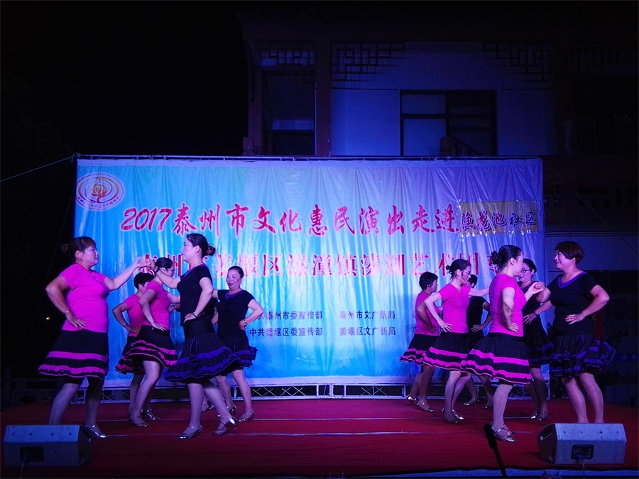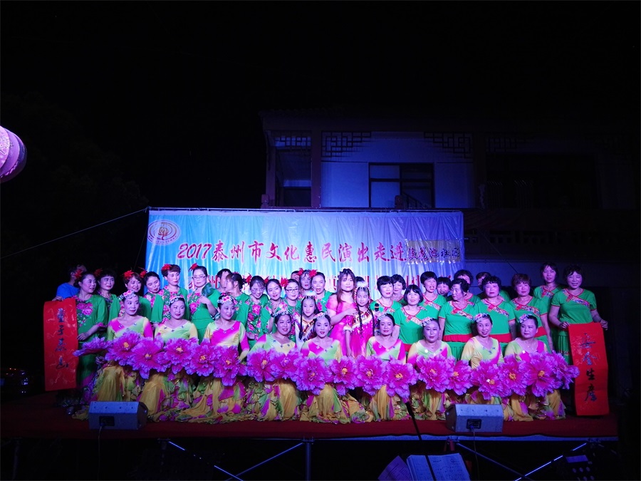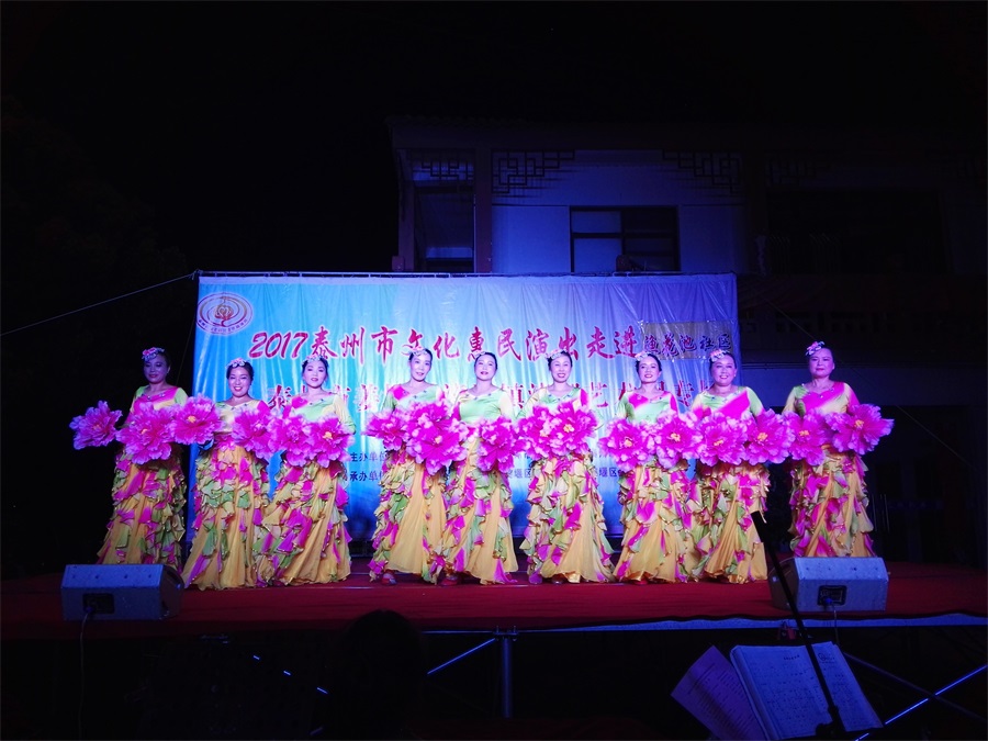 7月11日,姜堰区溱潼镇溱湖艺术团应溱潼镇渔花池社区邀请,2017年泰州市文化惠民券专场演出于当晚7点三十,在社区广场上演。团队专门搭建了大舞台,为适应观众不同层次的文化欣赏需求,溱湖艺术团精心策划了16个丰富多彩的文艺节目,随着欢快喜庆的音乐响起,舞蹈《红红火火大中华》拉开了演出序幕,当晚演出不仅有激情奔放的民歌与民舞,还有童星,而且有耳熟能详的戏曲,淮剧《手捧枝头花香藕》,还缴请当地群众上台表演,最后在舞蹈《走向复兴》结束晚会,整台演出效果好,弘扬社会正气,倡导诚实守信,气氛热烈,掌声不断,赢得了广大观众的一致好评。当天晚上演出时长100分钟,观众达到500多人,优美而精彩的表演,给社区居民送去一份丰盛的文化大餐。