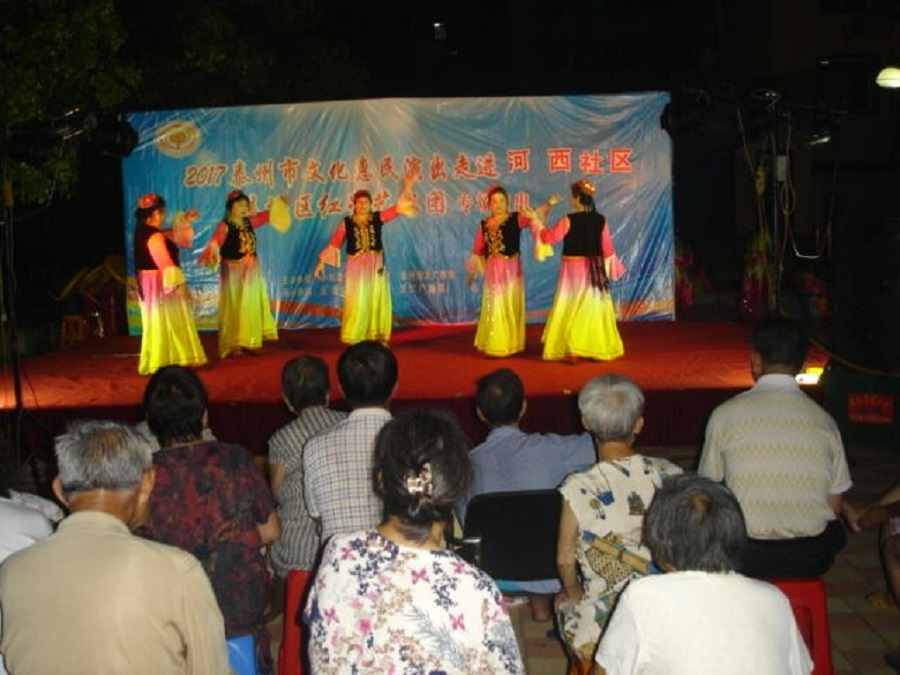 红星艺术团来到河西社区应邀演出,社区人民欢迎红星艺术团的到来,欢欣鼓舞闪亮开演,演员们兴高采烈表演多姿多彩的节目,迎来了欢乐的笑声和掌声。