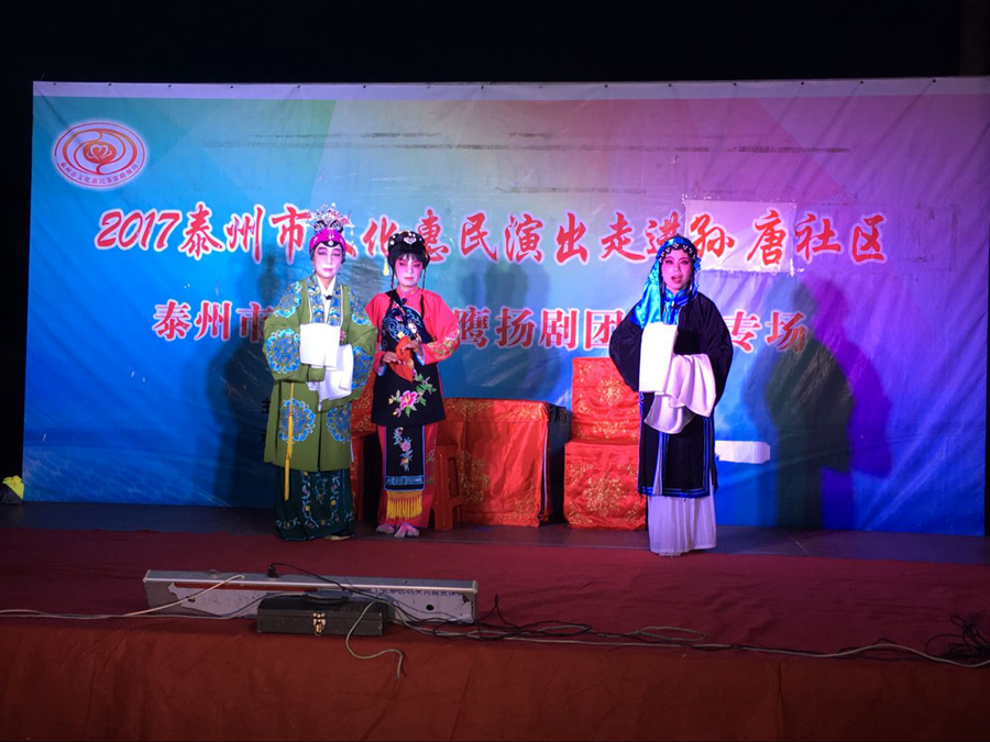 2017泰州市文化惠民演出走进海陵区京泰街道孙唐社区,海陵区小鹰扬剧团专场演出,2017年7月8日晚上在海陵区京泰街道孙唐社区文化广场成功举办。经典的扬剧折子戏博得了观众的阵阵掌声。演出很成功!感谢社区领导提供全方位的服务!