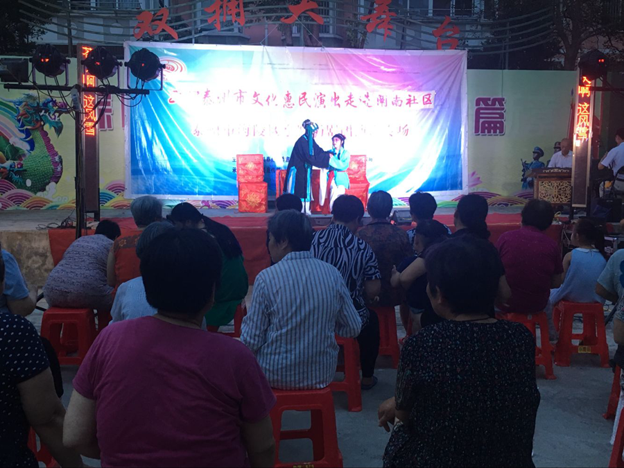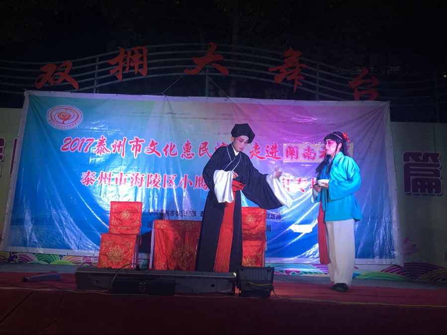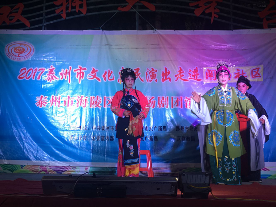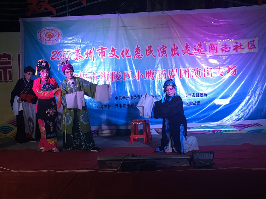 2017泰州市文化惠民演出走进海陵区城西街道闸南社区,海陵区小鹰扬剧团专场演出,2017年7月4日晚上在海陵区城西街道闸南社区百姓大舞台成功举办。经典的扬剧折子戏博得了观众的阵阵掌声。演出很成功!感谢社区领导提供全方位的服务!