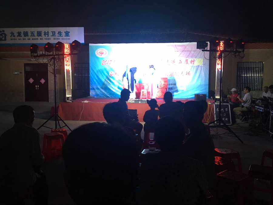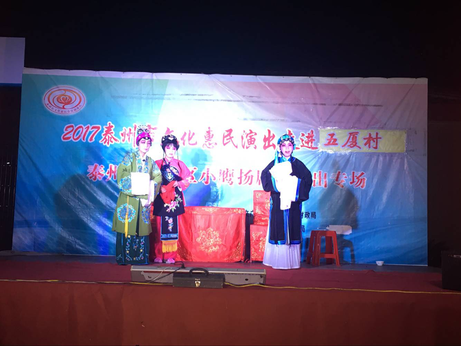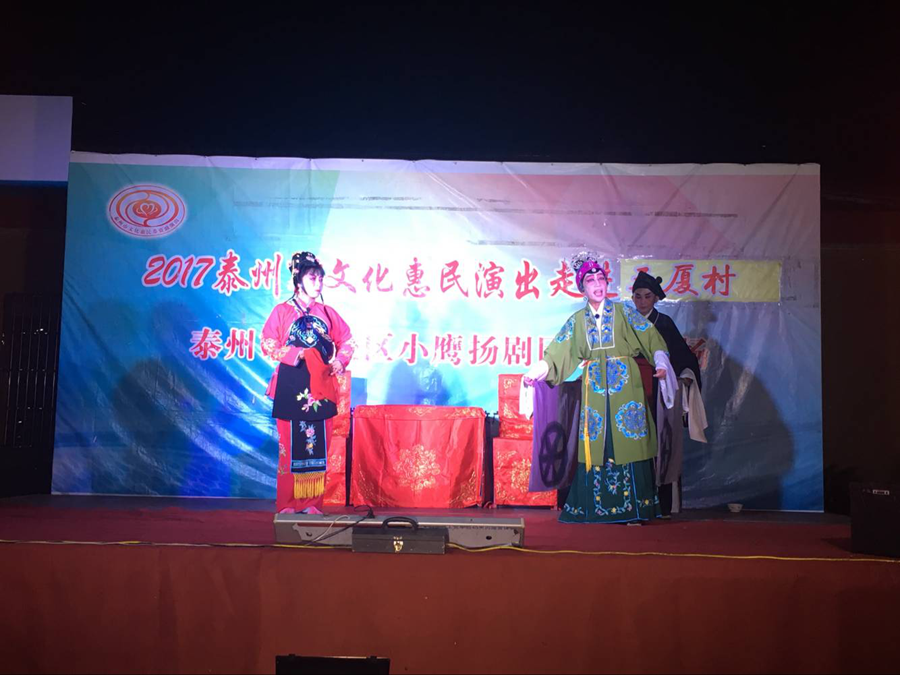 2017泰州市文化惠民演出走进海陵区九龙镇五厦村,海陵区小鹰扬剧团专场演出,2017年7月9日晚上在海陵区九龙镇五厦村文体广场成功举办。经典的扬剧折子戏博得了观众的阵阵掌声。天气虽然很热,但是大爷大妈们一直坚持看到最后。演出很成功!感谢社区领导提供全方位的服务!